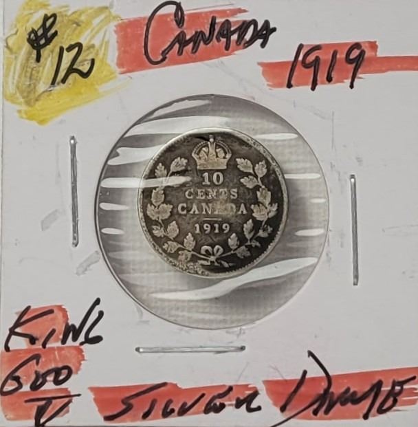 12) CANADIAN 1919 KING GEORGE 10 CENT COIN,
