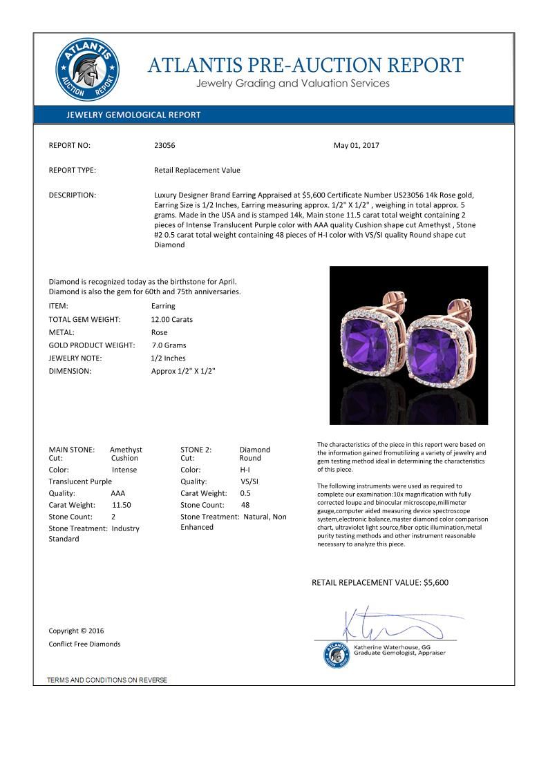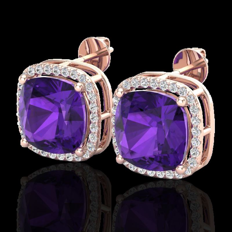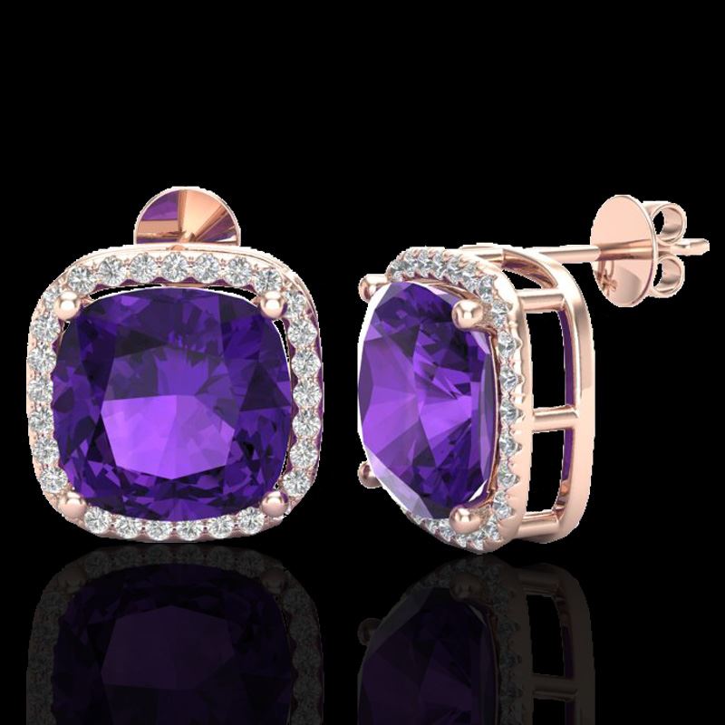 12 CTW Amethyst & Micro Pave Halo VS/SI Diamond Earrings 14K Rose Gold ---- Luxury Designer Brand Earring Appraised Retail Price at $5,600 ---- SKU Number US23056 14k Rose gold Earring Size is 1/2 Inches, Earring measuring approx. 1/2" X 1/2" , weighing in total approx. 5 grams. Made in the USA and is stamped 14k, Main stone 11.50 carat total weight containing 2 pieces of Intense Translucent Purple color with AAA quality Cushion shape cut Amethyst , Stone #2 0.5 carat total weight containing 48 pieces of H-I color with VS/SI quality Round shape cut