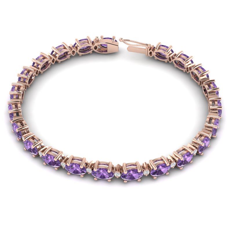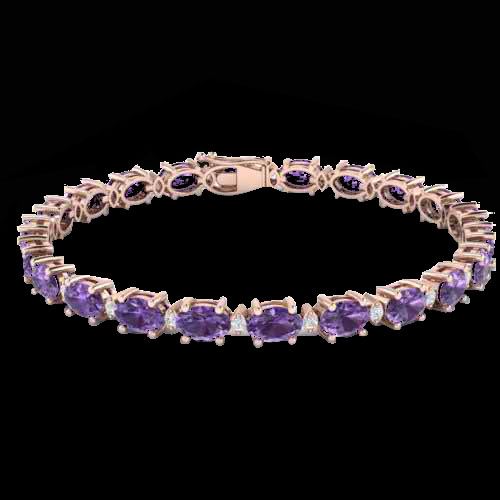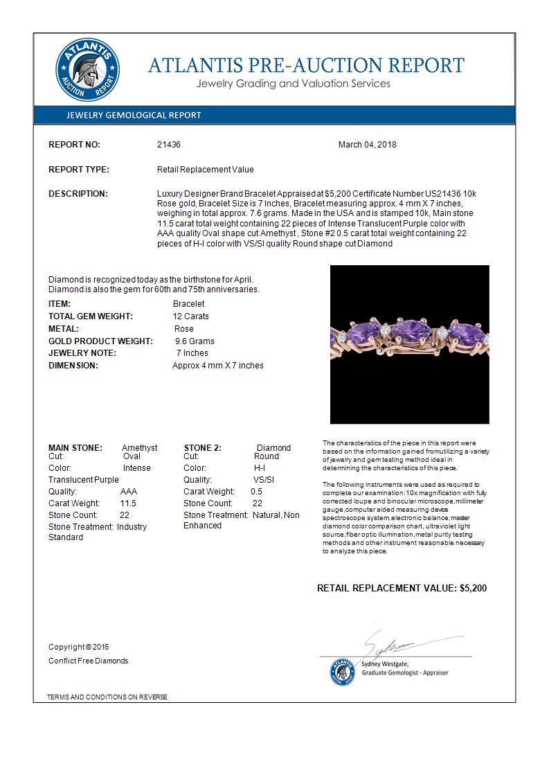 REF-72W5F -21436 ---- 12 CTW Amethyst & VS/SI Diamond Eternity Bracelet 10K Rose Gold ---- Luxury Designer Brand Bracelet Appraised at $5,200 Certificate Number US21436 10k Rose gold, Bracelet Size is 7 Inches, Bracelet measuring approx. 4 mm X 7 inches, weighing in total approx. 7.6 grams. Made in the USA and is stamped 10k, Main stone 11.5 carat total weight containing 22 pieces of Intense Translucent Purple color with AAA quality Oval shape cut Amethyst , Stone #2 0.5 carat total weight containing 22 pieces of H-I color with VS/SI quality Round shape cut Diamond