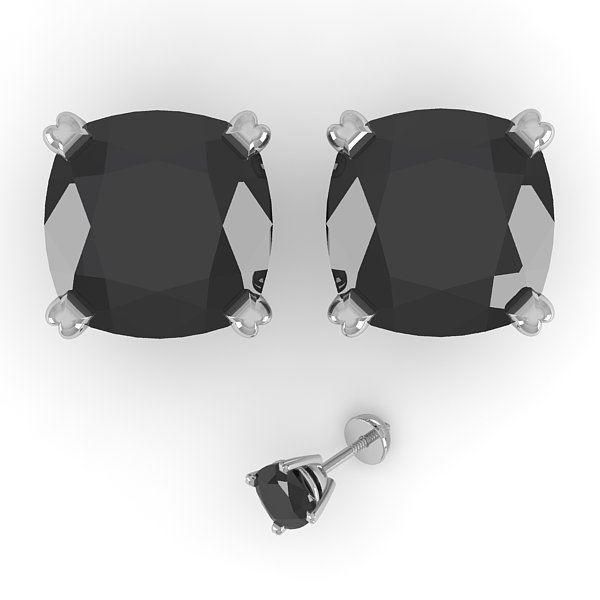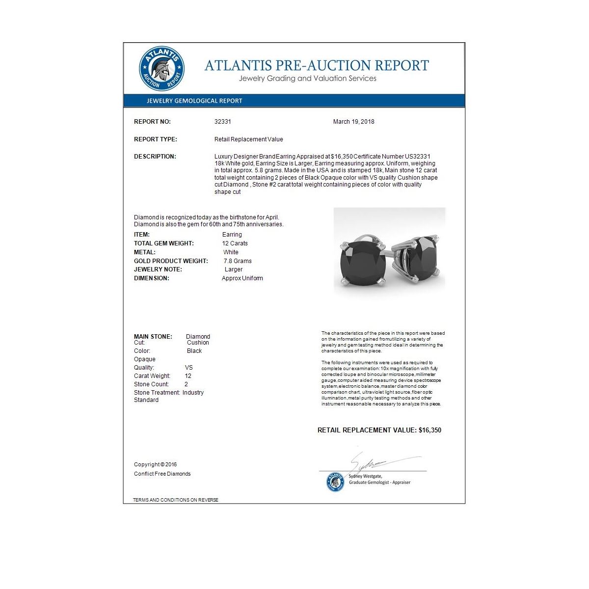 REF-270M2H -32331 ---- 12 CTW Cushion Black Diamond Stud Designer Earrings 18K White Gold ---- Luxury Designer Brand Earring Appraised at $16,350 Certificate Number US32331 18k White gold, Earring Size is Larger, Earring measuring approx. Uniform, weighing in total approx. 5.8 grams. Made in the USA and is stamped 18k, Main stone 12 carat total weight containing 2 pieces of Black Opaque color with VS quality Cushion shape cut Diamond , Stone #2 carat total weight containing pieces of color with quality shape cut