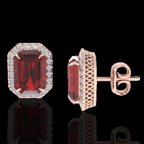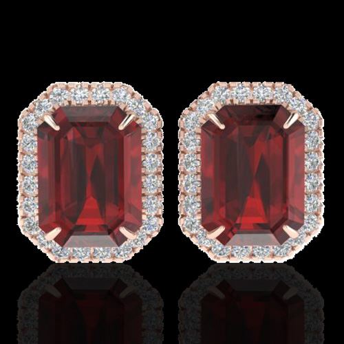 REF-65W6F -21226 ---- 12 CTW Garnet And Micro Pave VS/SI Diamond Halo Earrings 14K Rose Gold ---- Luxury Designer Brand Earring Appraised at $4,350 Certificate Number US21226 14k Rose gold, Earring Size is 1/2 Inches, Earring measuring approx. 1/2" X 1/2" , weighing in total approx. 5 grams. Made in the USA and is stamped 14k, Main stone 11.6 carat total weight containing 2 pieces of Saturated purplish Red color with AAA quality Emerald shape cut Garnet , Stone #2 0.4 carat total weight containing 50 pieces of H-I color with VS/SI quality Round shape cut Diamond