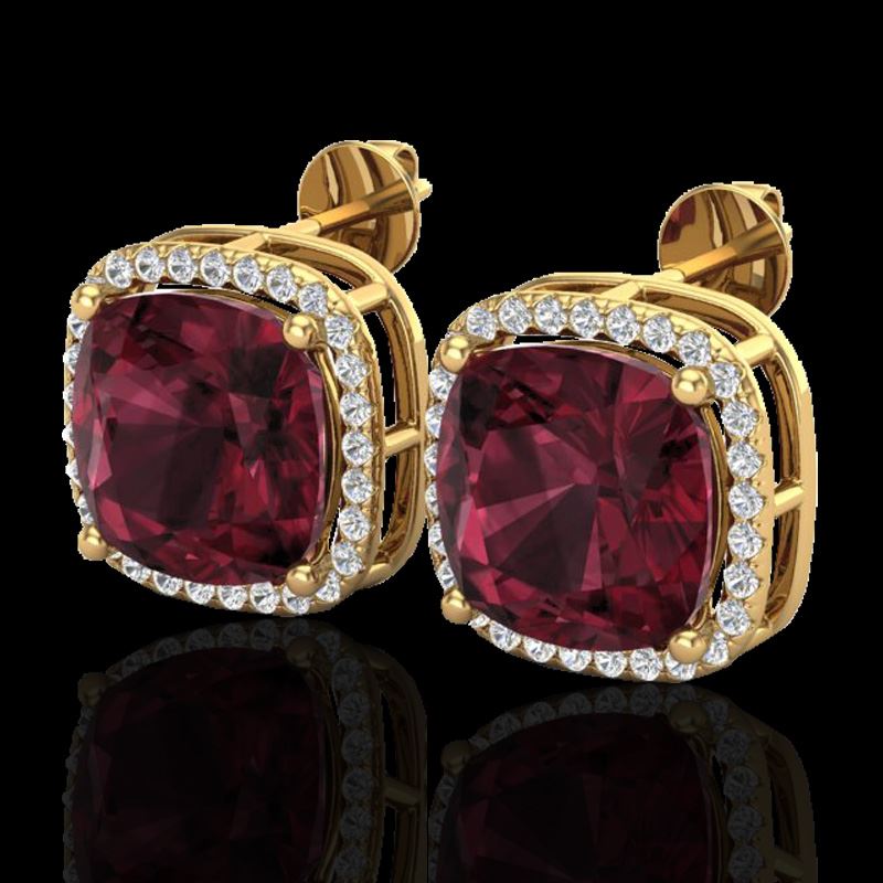 REF-88Y2K -23065 ---- 12 CTW Garnet & Micro Pave Halo VS/SI Diamond Earrings Solitaire 18K Yellow Gold ---- Luxury Designer Brand Earring Appraised at $5,800 Certificate Number US23065 18k Yellow gold, Earring Size is 1/2 Inches, Earring measuring approx. 1/2" X 1/2" , weighing in total approx. 4.8 grams. Made in the USA and is stamped 18k, Main stone 11.5 carat total weight containing 2 pieces of Saturated purplish Red color with AAA quality Cushion shape cut Garnet , Stone #2 0.5 carat total weight containing 48 pieces of H-I color with VS/SI quality Round shape cut Diamond