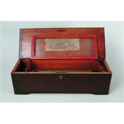 Lot # 667 12" CYLINDER MUSIC BOX. Likely 6 tunes (paper not legible). Box is complete with the exception of some inlay on lid. Unrestored condition. SIZE: 20-1/2" l x 6" h x 7-3/4" d. CONDITION: Missing two teeth and one tip, some bent pins on cylinder. Plays, but needs restoration. 1-28851 (400-600)