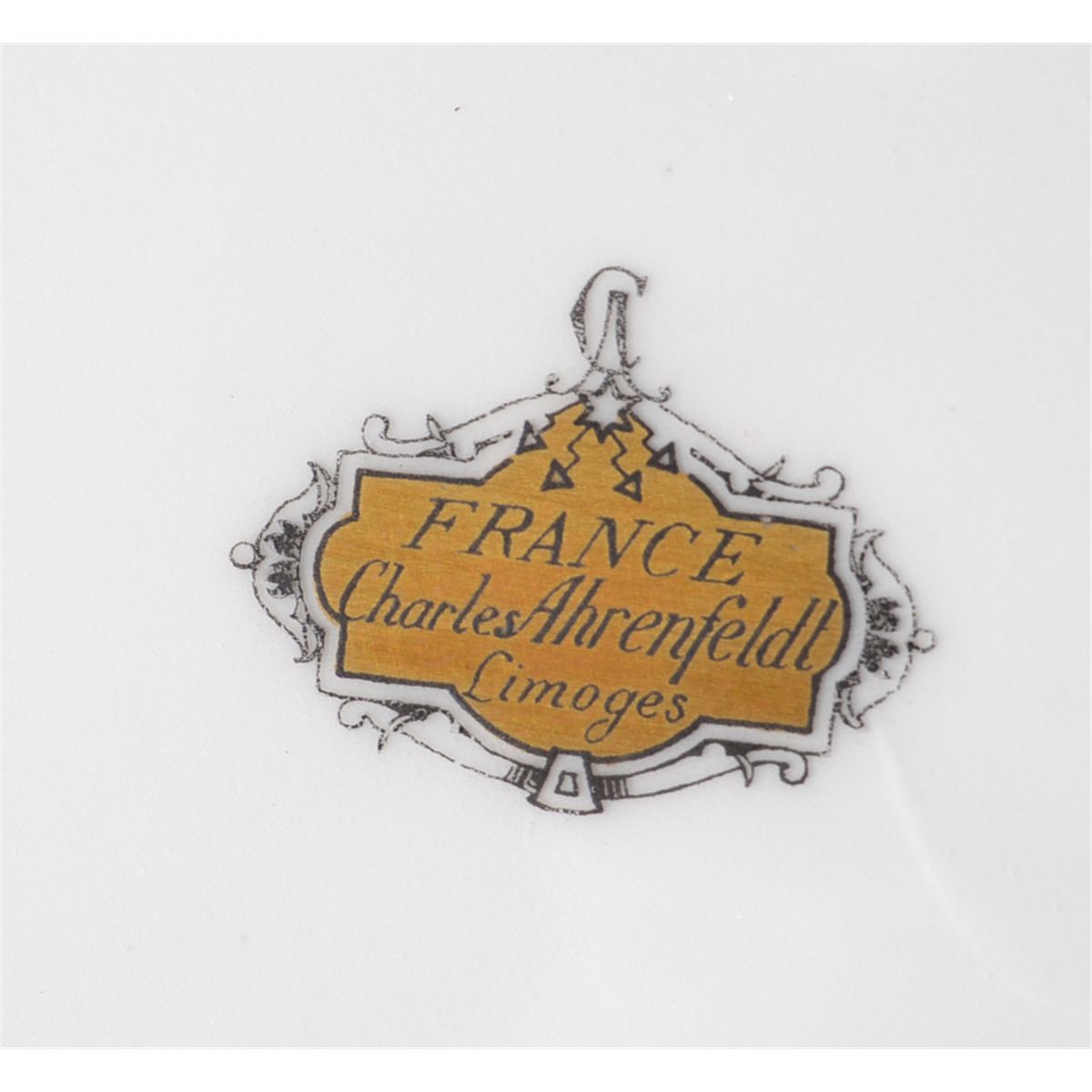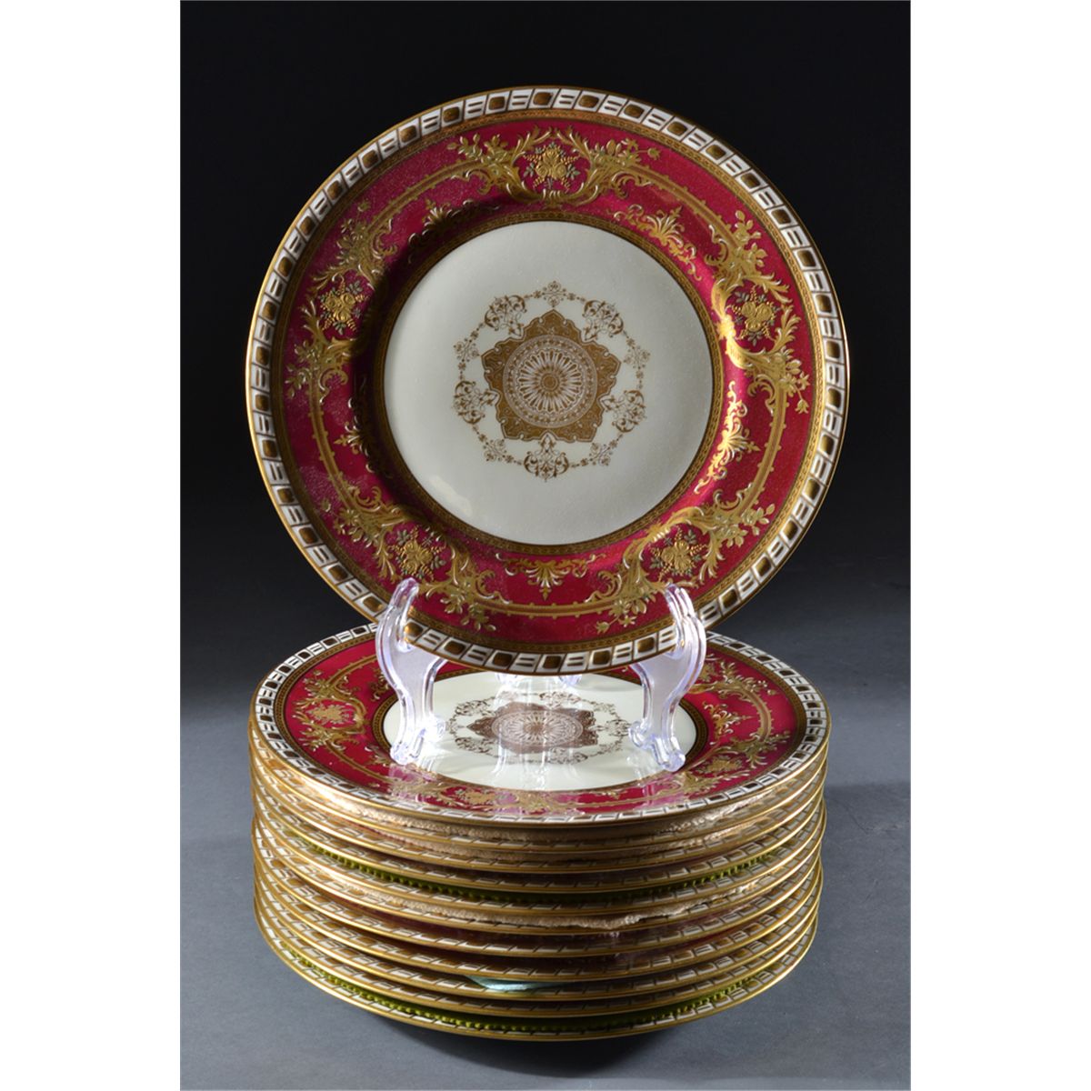 Profusely decorated in raised gilt with scrolling foliage against a raspberry ground with a central gilt panel against a cream ground. All marked France, Charles Ahrnfeldt, Limoges within a gilt plaque to each plate. Circa late 19th/ early 20th century. Private collection Ada, MI.