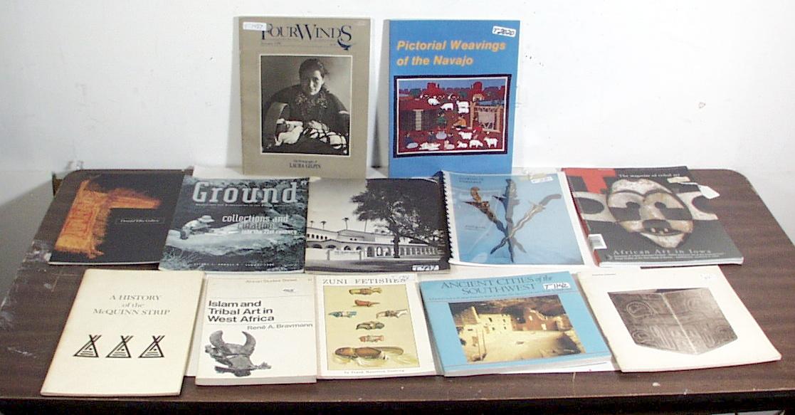 1) A History of the McQuinn Strip. Softcover. 32 pages. 1972. Good condition. 7" x 10-1/2" 2) Islam and Tribal Art in West Africa by Rene A. Bravmann. Softcover. 185 pages. 1980. Very good condition. 6" x 9". 3) Zuni Fetishes by Frank Hamilton Cushing. Softcover. 43 pages. 1883, 1966. Very good condition. 6" x 9". 4) Ancient Cities of the Southwest; a practical guide to the major prehistoric ruins of Arizona, New Mexico, Utah, and colorado by Buddy Mays. Softcover. 130 pages. 1990. Very good condition. 8-1/2" x 8". 5) Quevillon Collection; Catalogue of Eskimo and Northwest Coast Indian Art. 1984. 44 pages. good condition. 9" x 9". 6) Donald Ellis Gallery. 1998. 12 pages. Excellent condition. 7" x 11". 7) Common Ground; Archeology and Ethnology in the Public Interest. Summer 1996. 8) The Heard Museum, Phoenix Arizona 1969. Softcover. Good condition. 8-1/2" x 11". 9) Weapons of Moroland. Field guide 2nd edition. 1998. Very good condition. 8-1/2" x 11". 10) The Magazine of Tribal Art Winter 2002. Good condition. 11) Four Winds Magazine. Autumn