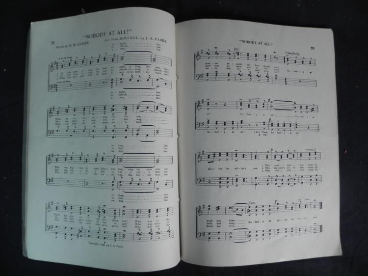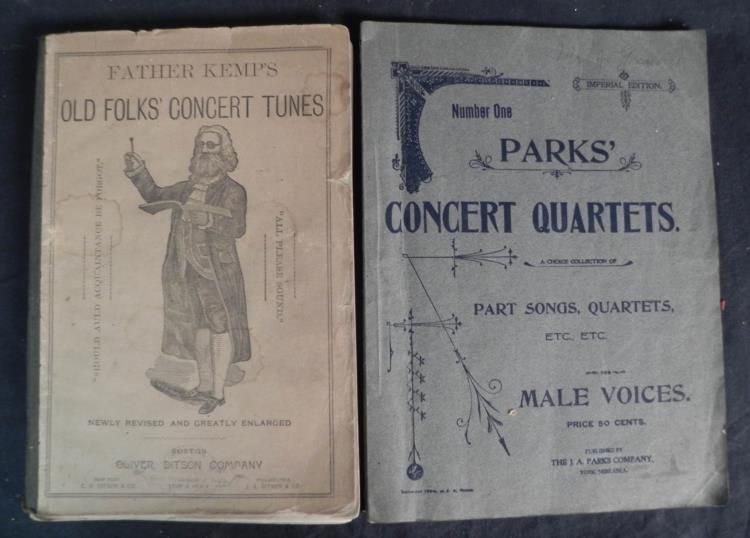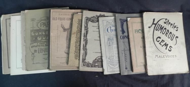 Here is a list of original song books in good condition, from the estate, with covers and all pages as follows: - Parks Concert Quartets - 1896 - Choir Leader - 1894 - G. Schirmers Collection of Cantatas - Steele's Humors Gems for Male Voices - 1890 - Old Folks Concert Tunes - 1889 - Parks Sacred Quartets for Female Voices - In the Days of Yore - Old Folks for Home Talent - 1896 - Holy on of Israel - Cantata - Fifth Annual Music Festival - Barbara Frietchie Soprano England Patriotic Ballad - Parks Concert Quartet for Female Voices - 1898