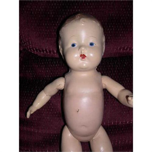 12" Composition Doll with straight legs. It has molded hair. There is a little crack in the compo just above mouth. There is a staple in the stomach where apparently clothes were attached at one time. Doll comes from a smoke free env ironment. Buyer to pay $15 for shipping, handling, and insurance. Thanks for viewing.
