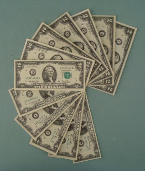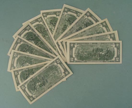 Run of (12) 1976 $2 Bills, all from different banks Mint Marks: A, B, C, D, E, F, G, H, I, J, K, LCondition details: Crisp Uncirculated to Almost Uncirculated
