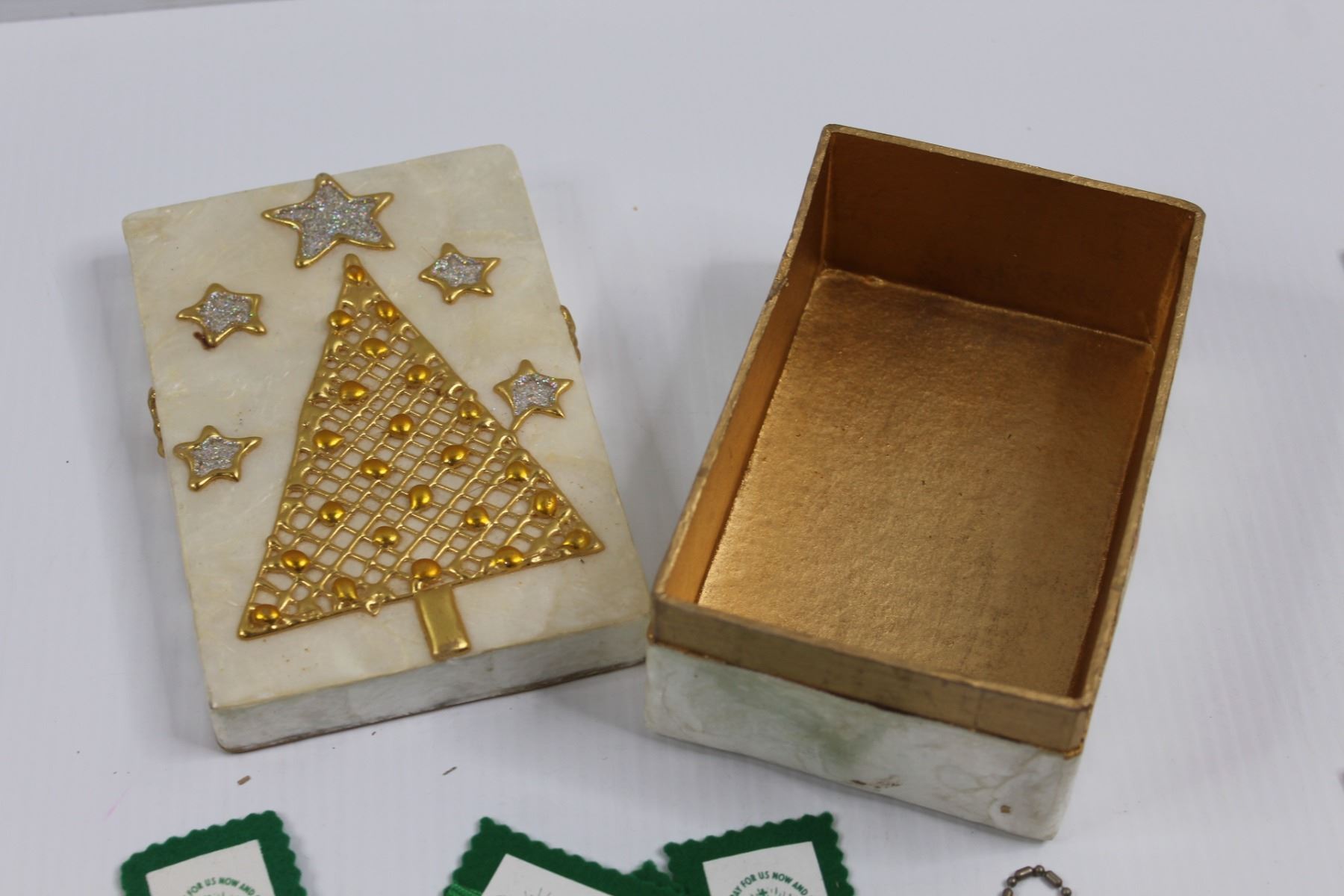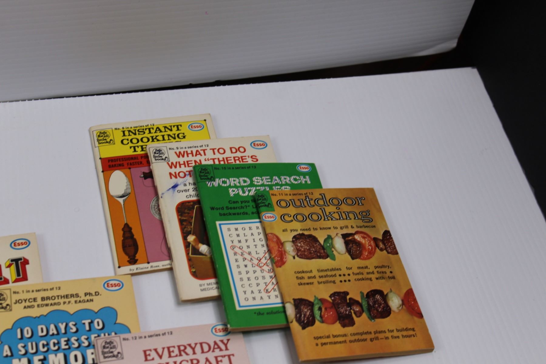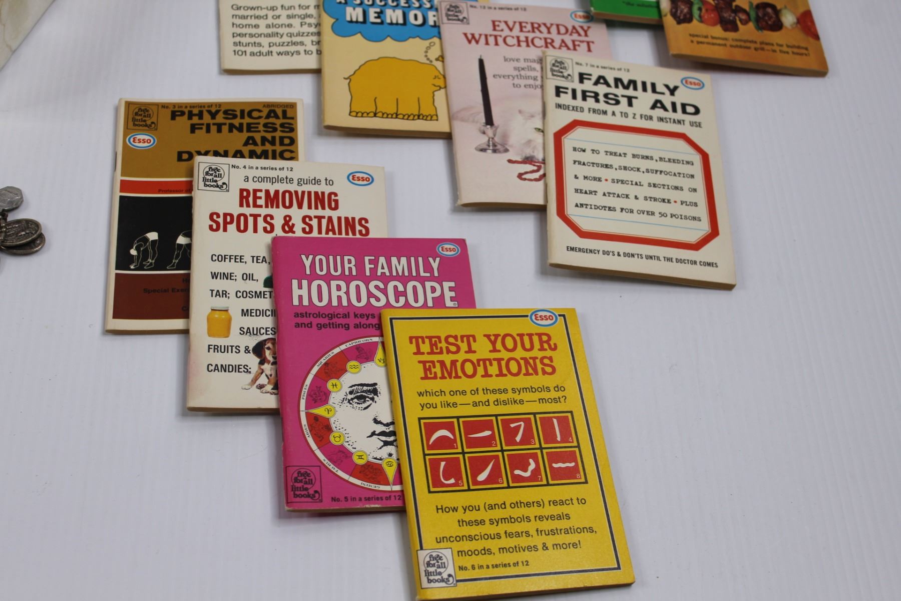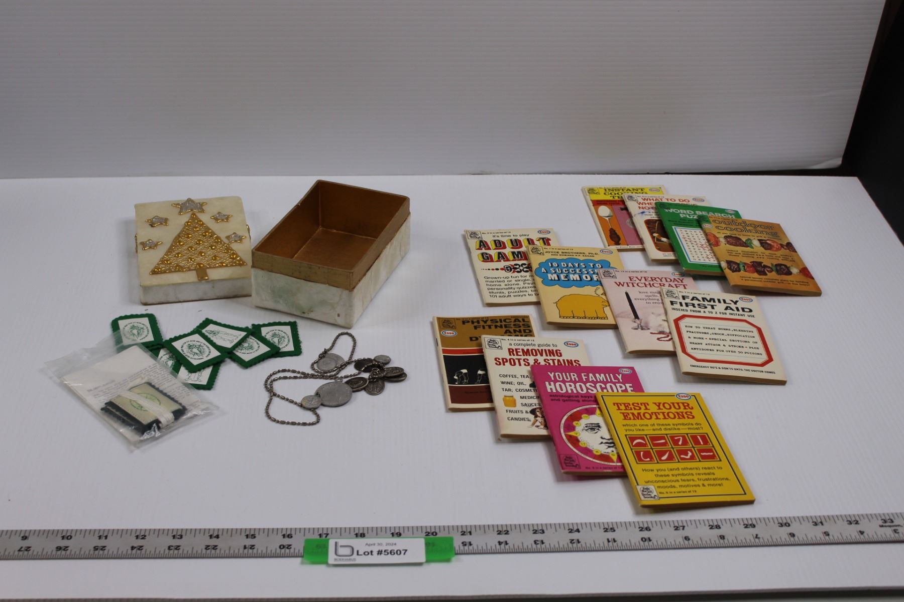 (12) ESSO Mini Books of Varying Subject Matter, Christmas Themed Box w/Lid & Vintage Catholic Metals etc.