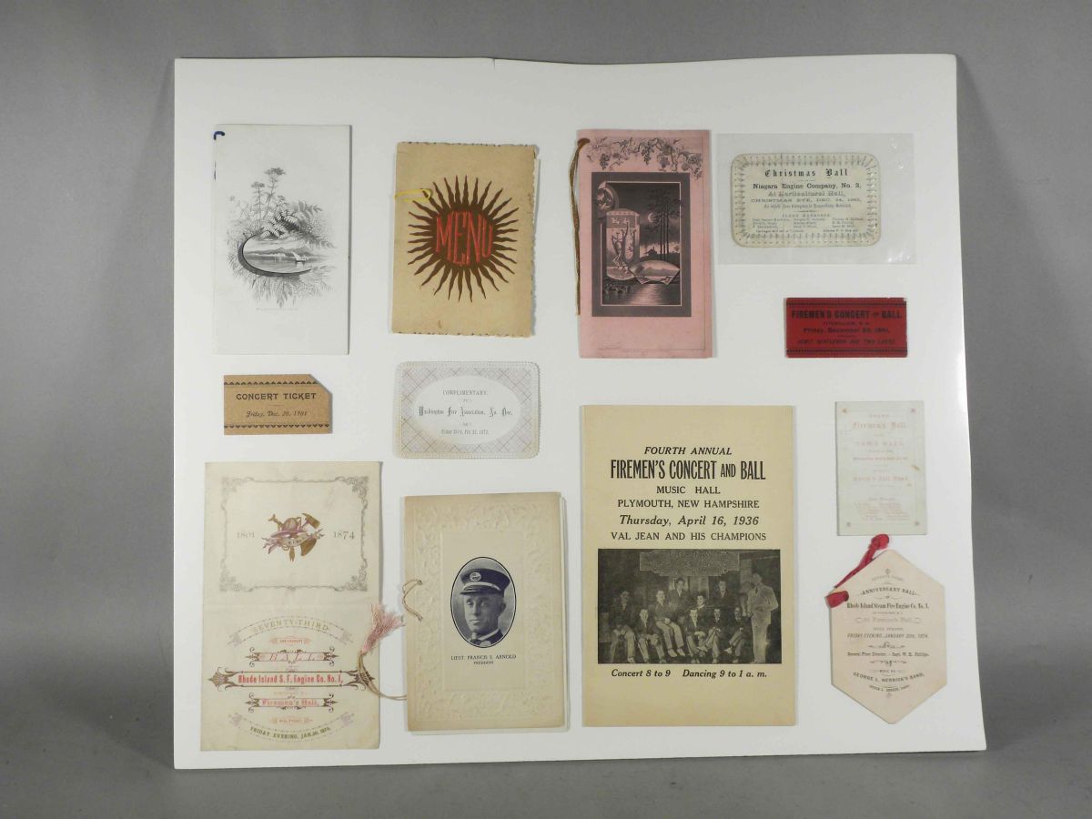 Lot of 12 Firemen's Ball and Concert Related Items for New Hampshire and Massachusetts. Including invitations, tickets, menu, program and dance cards. Various sizes and conditions.