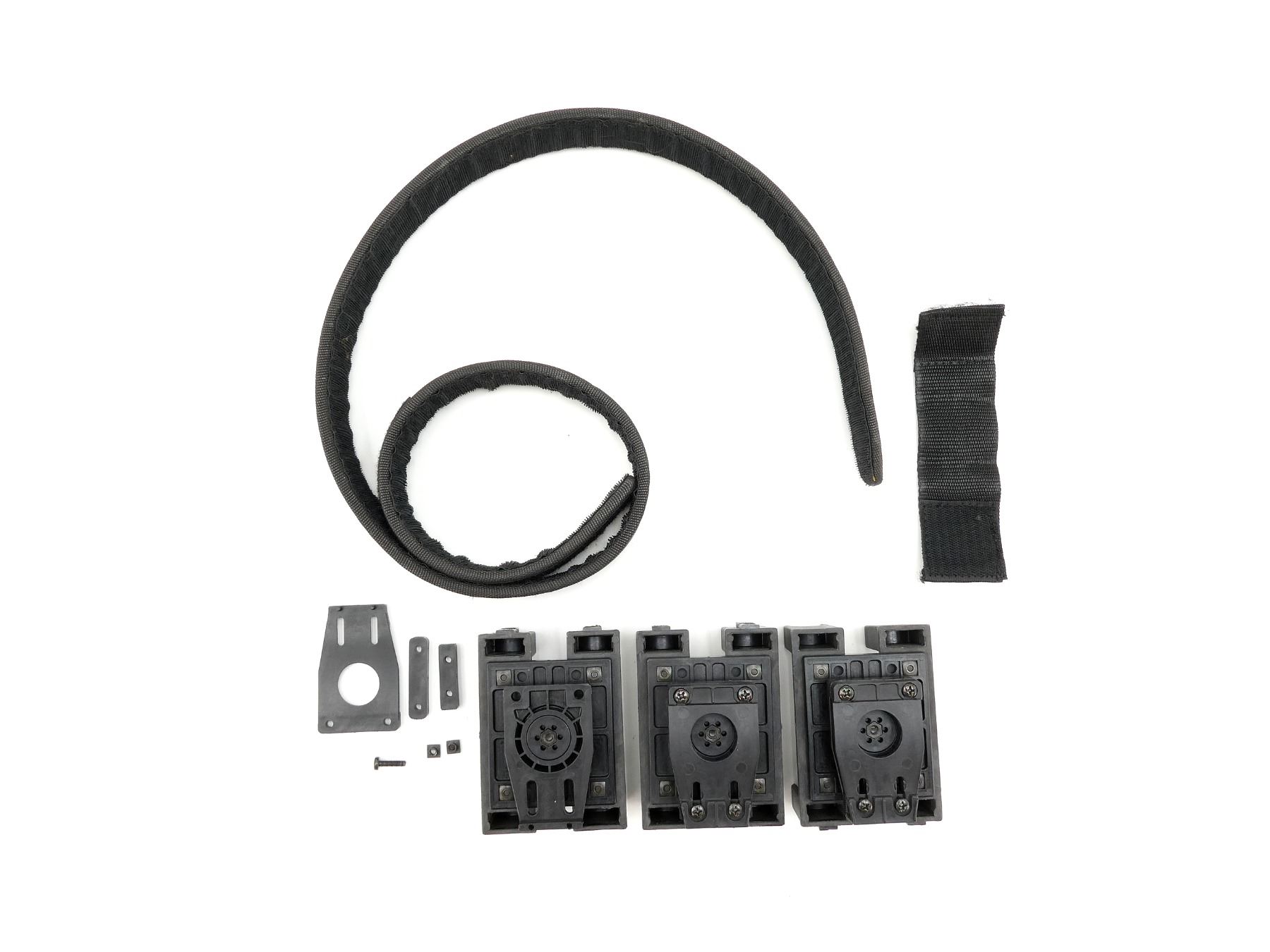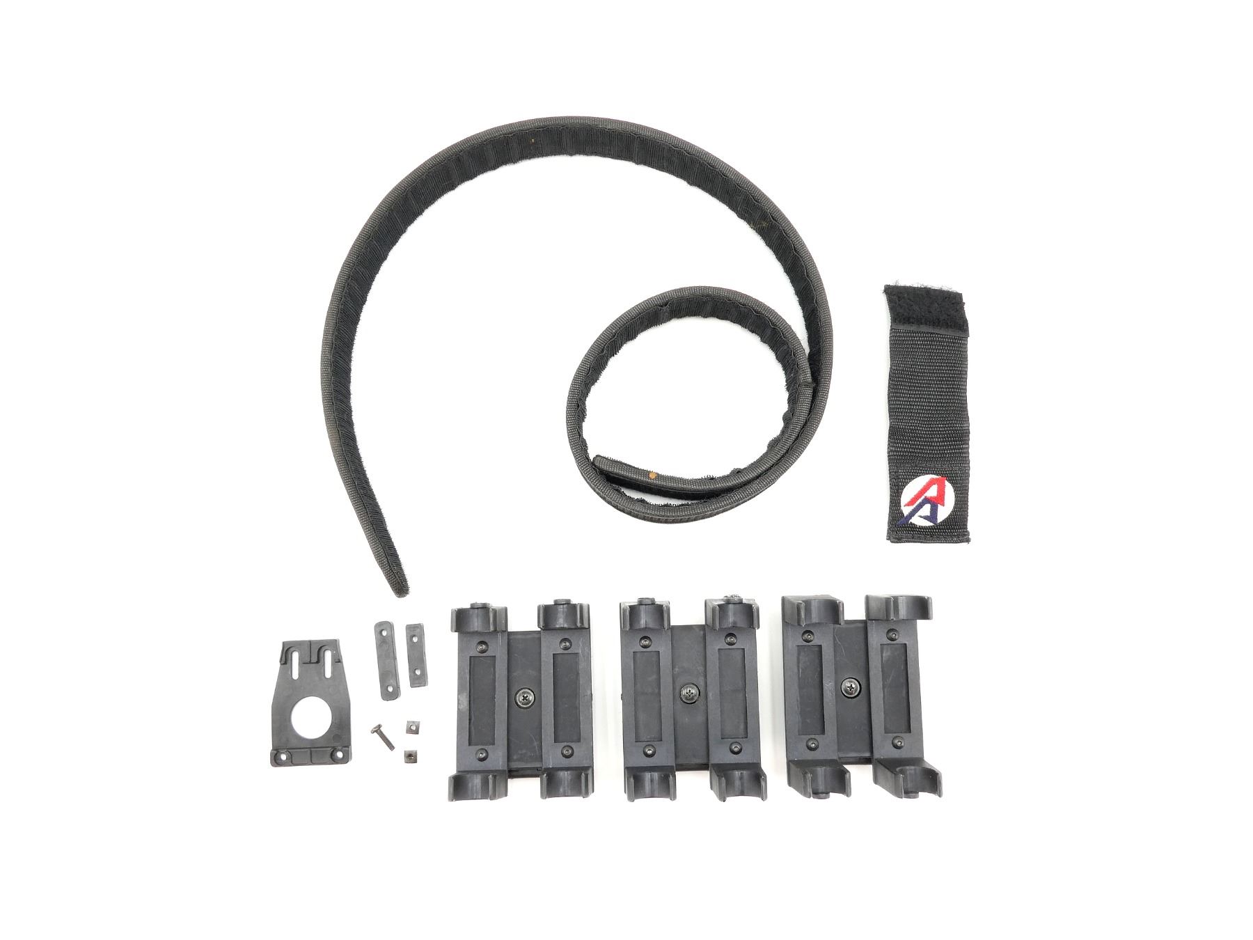 LOT INCLUDES; (3) EACH HOLDS FOUR ROUNDS, EACH HAVE A SWIVEL BELT CLIPS, TWO ARE COMPLETE, ONE IS MISSING A COUPLE SCREWS ON BELT CLIP & (1) DOUBLE ALPHA ACADEMY PREMIUM COMPETITION PISTOL BELT, BLACK NYLON / VELCRO, FITS 36" WAIST, ADJUSTABLE, OAL APPROX. 49.5". SEE PHOTOS.