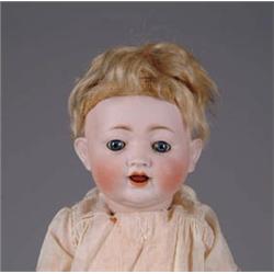 12” GERMAN OPEN MOUTH BABY. Cute as a button! This all original open-mouth baby has blue glass sleep eyes, original mohair wig and baby gown (light soiling). Marked on rear of head “Germany 99/4”. She is on a composition baby body marked “K&W” CONDITION: Minor nose rub and cheek scuff. JL 1-2562