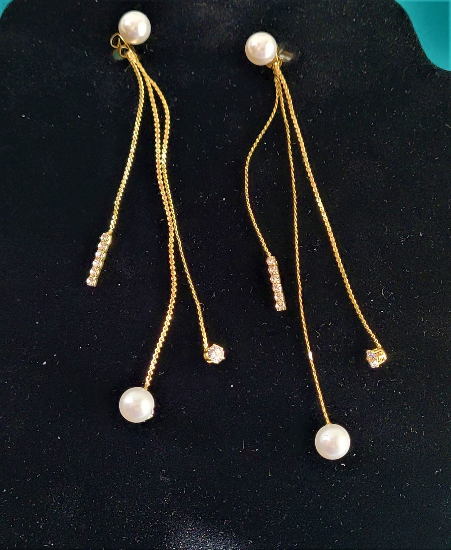 CONVERTIBLE STUD EARRINGS WITH 2 SETS OF BACKS, THE BUTTERFLY BACKS MAKE THEM PLAIN STUDS AND THE LARGER BACKS ARE ATTACHED TO TRIPLE GOLD TONE CHAINS WITH ACCENTS. JEWELLERY