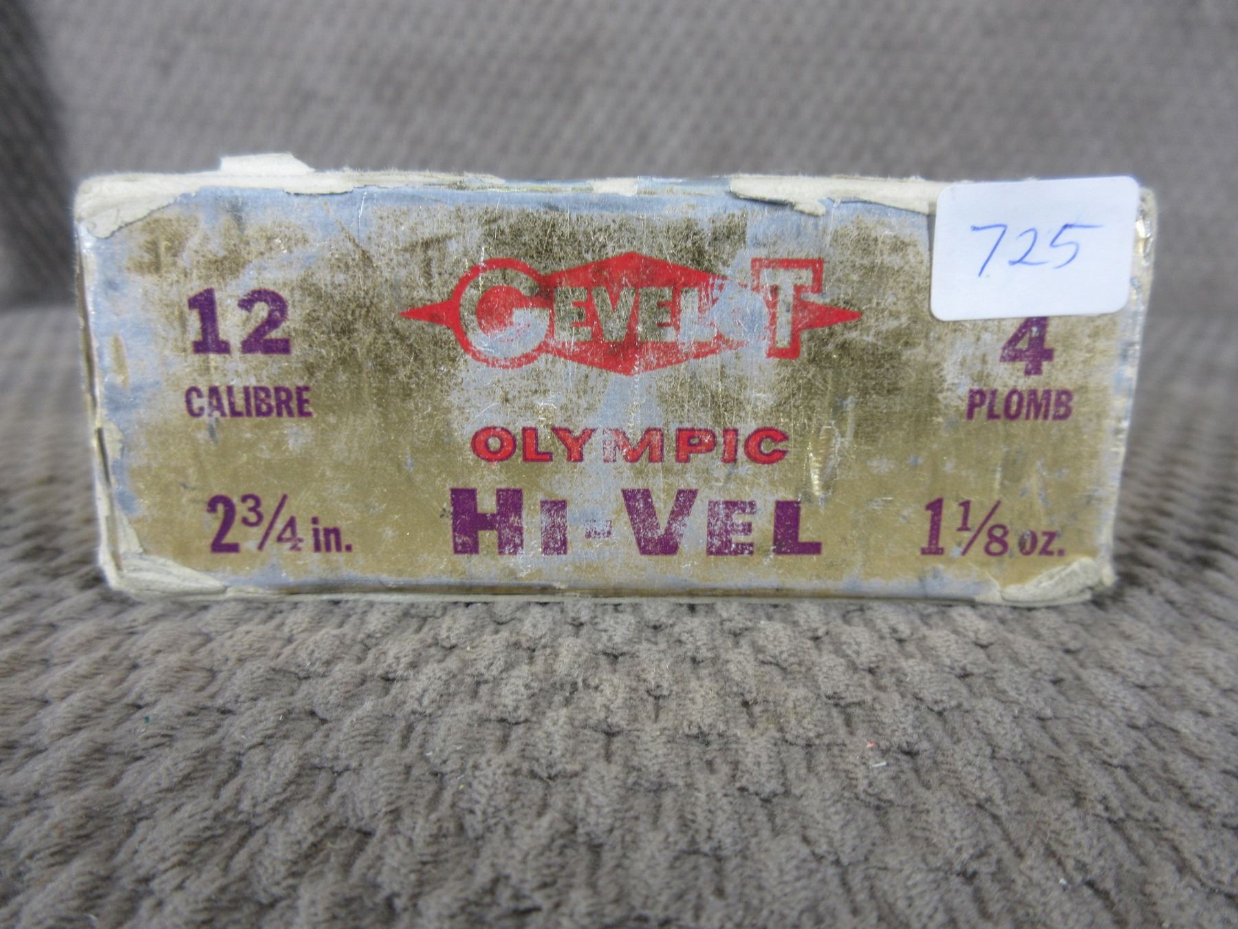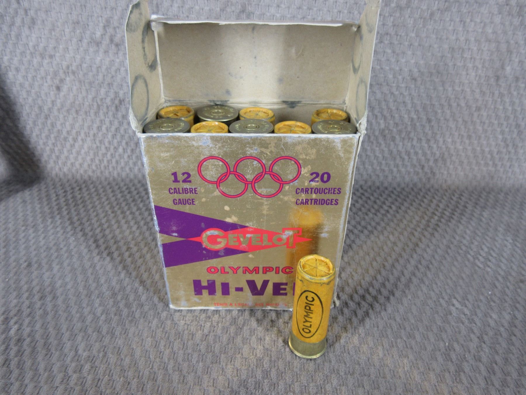 12 Ga 2 3/4" Box of 20 Gevelot Vintage Collector Ammo - Gevelot Olympic Hi-Vel #4, Yellow Star Crimp, Box made in Saskatoon