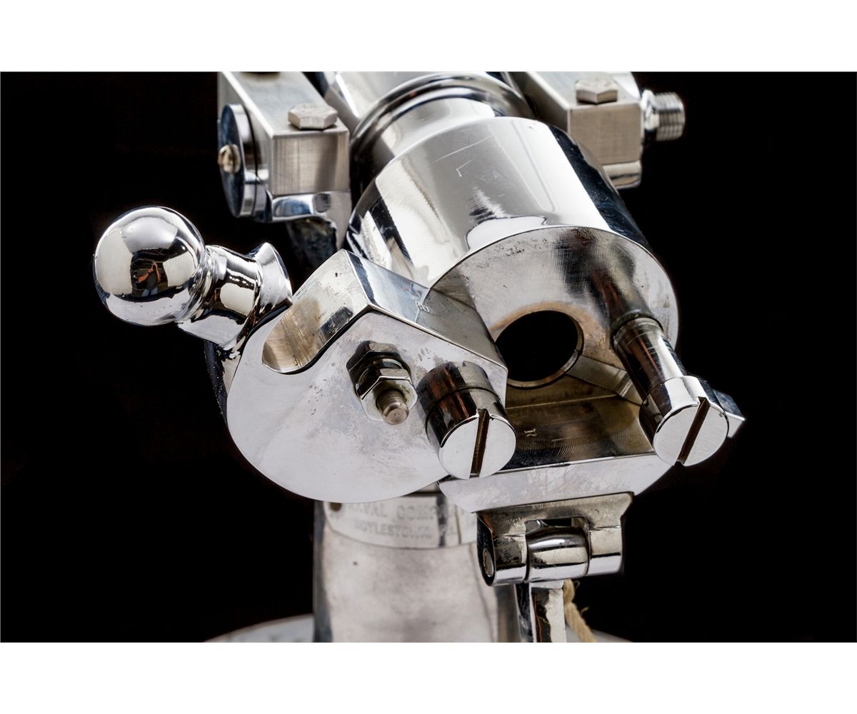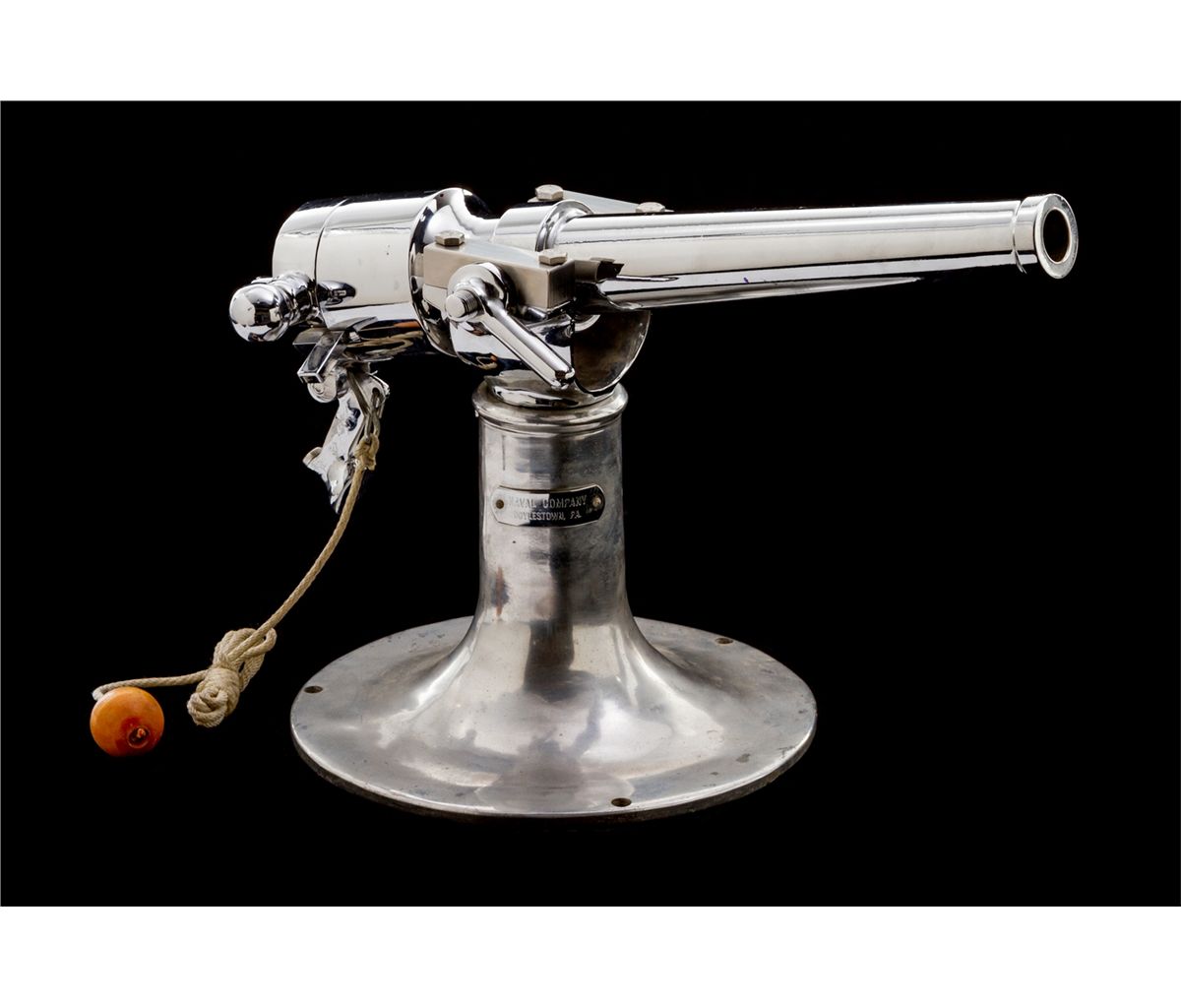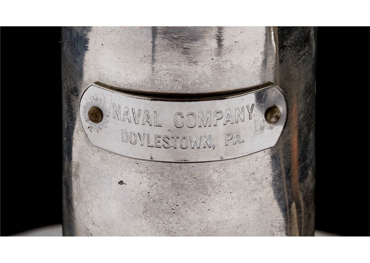 High Quality 12-Gauge Chrome-Plated Bronze Signal Cannon, by Naval Co. Inc., Doyleston, PA, 13-1/2'' barrel, on mountable aluminum pedestal with manufacturer's plaque. Naval Co. Inc. has been under the same ownership since 1939 and has mfg'd many line-throwing and signal cannons for both the U.S. Coast Guard and the private sector. This particular example was mfg'd prior to 1960. Condition is excellent with light patination and is possibly unfired. Est.: $1,000-$1,500.