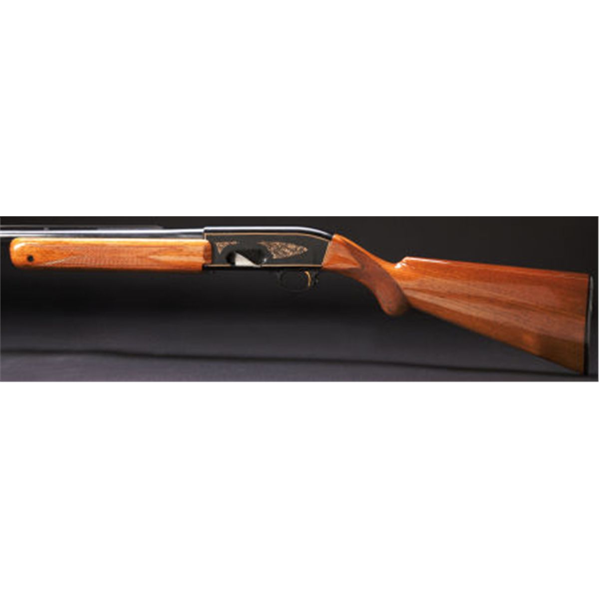 **12 Gauge Browning Double Auto Semiautomatic Shotgun. Serial no. 5A49366. 12 gauge. 25 1/2-inch barrel with ventilated rib. Border engraved blued action with floral medallion on sides. Gold filled engraving. Gold plated trigger. Finely checkered pistol grip stock of straight grain walnut. Finely checkered enlarged fore-end. Data: Pull: 14 1/2 inches. Choke: 0.002 inches (Cylinder). Condition: Excellent, showing limited use. Metal shows 99% blued finish. Excellent bright bore. Stock shows a few light marks.