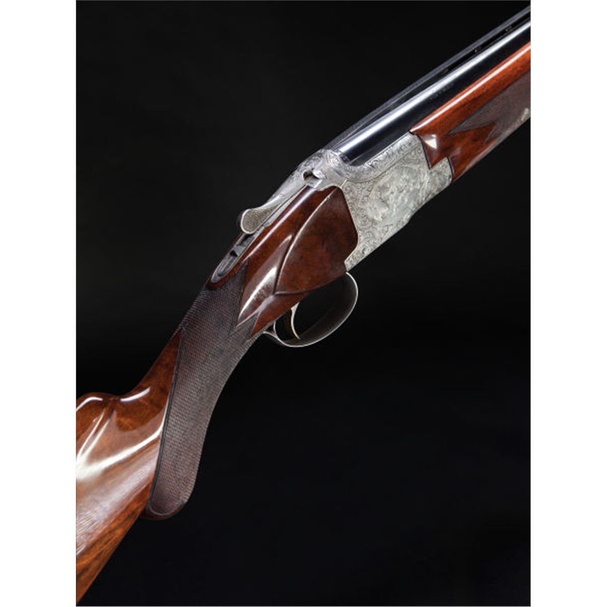 *12 Gauge Browning Grade V Superposed Shotgun. Serial no. 58720. 12 gauge. 28-inch barrels with matted ventilated rib with double beads. Coin finished action fully engraved with floral designs and game scenes: Left side: group of pheasants in a woodland setting, right side: group of ducks in a woodland pond. Underside shows a pair of grouse in flight and a pair of hares. Ejectors. Single selective trigger. Non-automatic safety. Gold plated trigger. Long tang. Previous owner's name engraved under the top lever. Finely checkered semi-pistolgrip stock of highly figured walnut with a round knob. White Line recoil pad. Finely checkered standard size fore-end. The gun was made in 1959. Later tan synthetic pig skin covered trunk case with green baize interior and two brass locks. Data: Barrel Dimensions: Bores: 0.731/0.731 inches. Chokes: 0.030/0.014 inches. Chambers: 2 3/4 inches. Minimum wall thickness: 0.030 inches. Stock Dimensions: Pull: 14 3/8 inches. Drop at comb: 1 1/2 inches. Drop at heel: 2 3/8 inches. Cast: None. Weight: 7 pounds, 14 ounces. Condition: Excellent, as partially redone. Barrels show 98-99% bluing. Excellent bright bores. Bottom bore shows slight streaking. Top barrel shows a slight bulge 2 1/2 inches from the muzzle. Stock shows a recoated finish with a few mostly light marks. Hardened recoil pad. Trunk case in excellent condition. Brass locks are discolored. Stock and action need spacers to fit snugly in case.