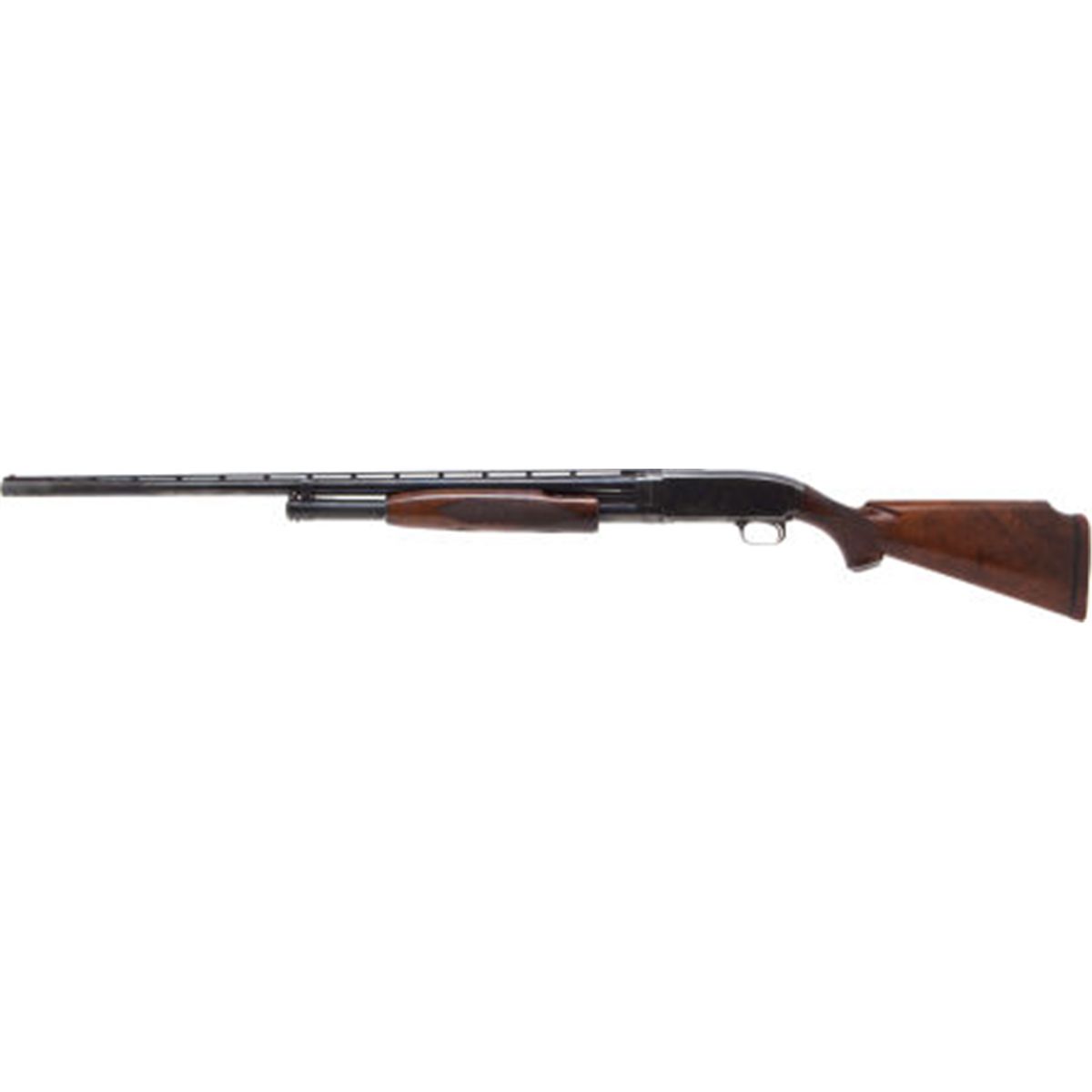 12 Gauge Winchester Model 12 Pigeon Grade Shotgun. Serial no. 1741597. 12 gauge. 30-inch barrel with ventilated rib. Blued slide action with engine turned bolt. Pigeon on magazine tube. Checkered Monte Carlo pistolgrip stock of well figured walnut. Checkered enlarged fore-end of well figured walnut. Maker's recoil pad. Data: Choke: 0.036 inches (Full). Pull: 14 3/8 inches. Condition: Excellent. Barrel shows 94-96% bluing with losses near breech. Action shows 97-98% bluing with losses to edges. Bright excellent bore. Magazine tube shows 50-60% bluing. Stock shows a few light marks. NRA FIREARMS FOR FREEDOM PROGRAM