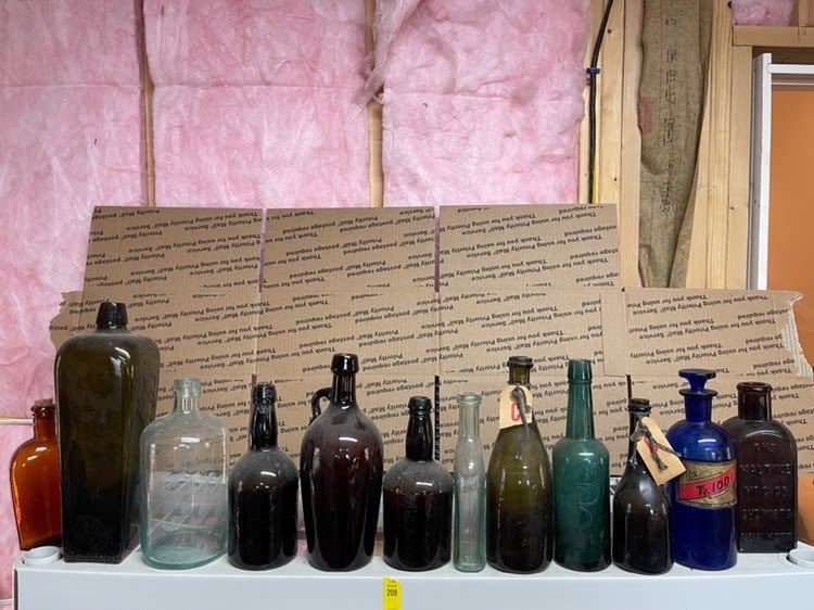 12 Vintage glass bottles including gin, jug, brown, glass, blue apothocary, bitter, etc, all from the attic!