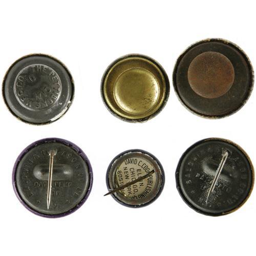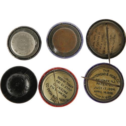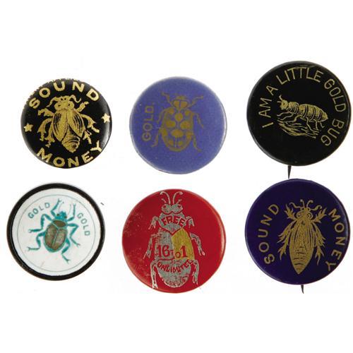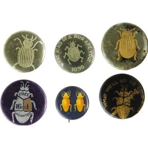 <B>An Exceptionally Nice Group of 1896 "Gold Bug" and "Silver Bug" Items.</B></I> Six pinbacks, and six lapel studs, ranging in size from 3/4" to 1" (all shown to size). All excellent except one stud with "foggy" celluloid lamination. Some quite scarce varieties. <BR><BR> Monetary issues dominated the 1896 election, and gold standard supporters were known as "Gold Bugs", while silver supporters were called "Silver Bugs." This fine group is <I>From the Norman Loewenstern Collection.</B></I>
