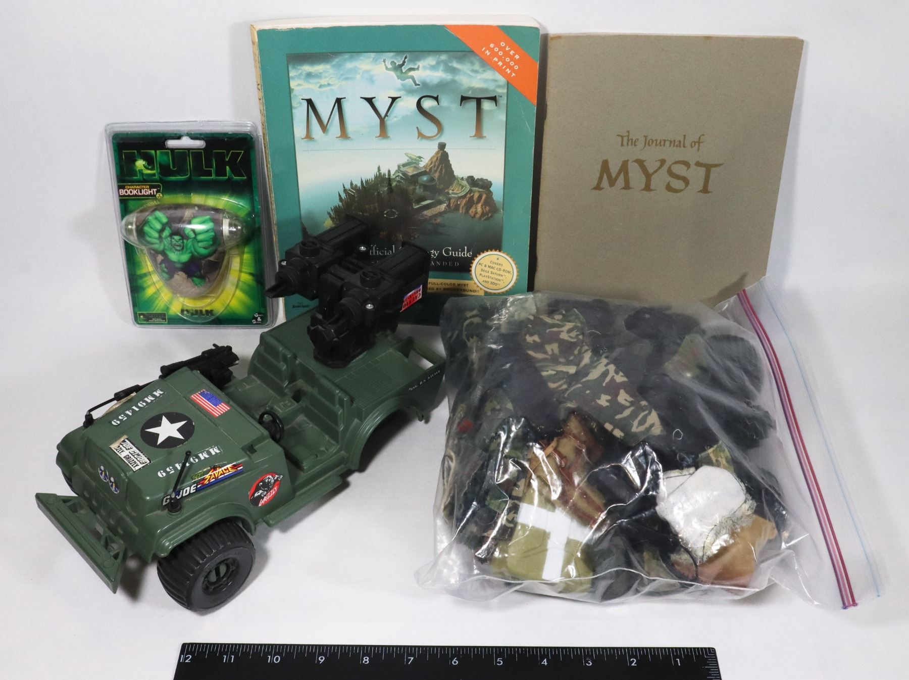 ACTION MAN ASSORTED WEAPONS CLOTHES BOOTS ACCESSORIES ETC SOLD WITH GI JOE ARAH 1994 SGT SAVAGE GRIZZLY JEEP SGT SAVAGE GRIZZLY JEEP SOLD WITH SEALED HULK CHARACTER BOOK LIGHT 2003 AND MYST VIDEO GAME STRATEGY GUIDE + JOURNAL VINTAGE GUIDE 1995 INCLUDES MAPE
