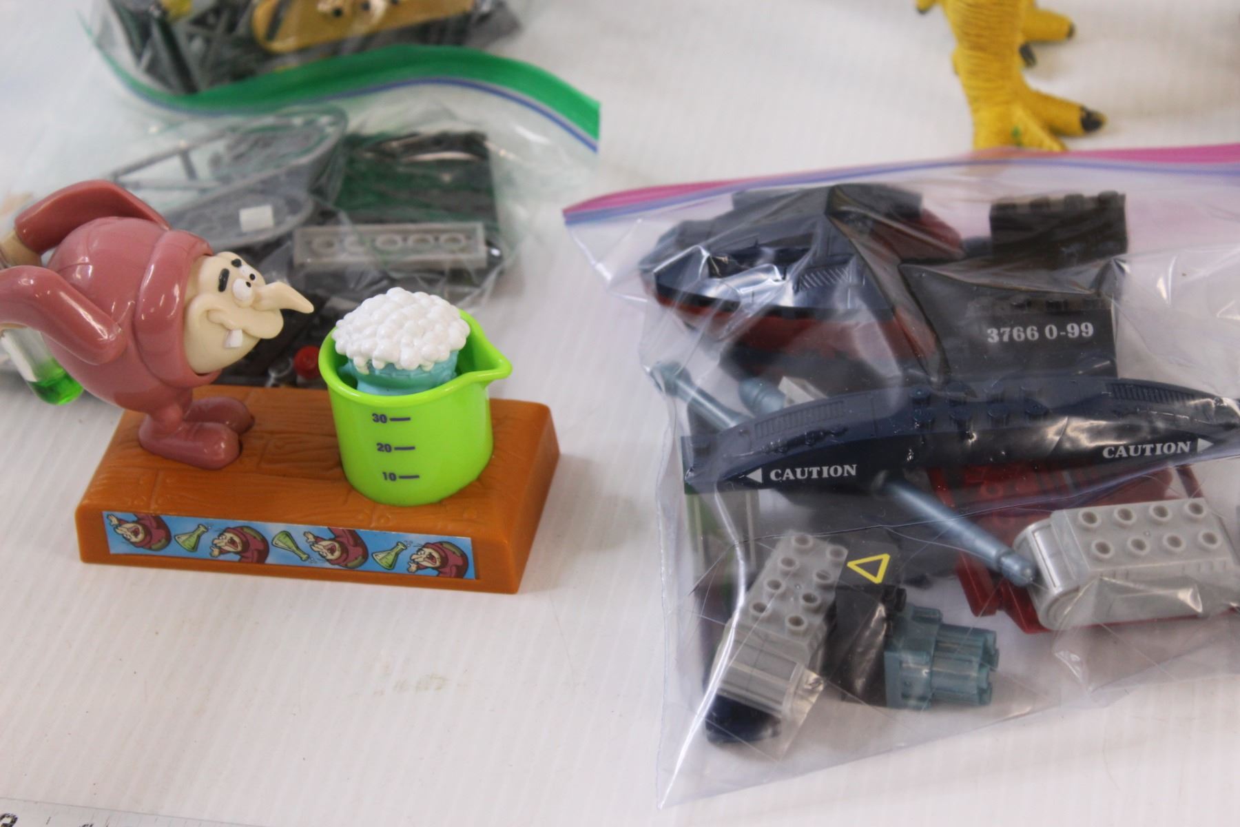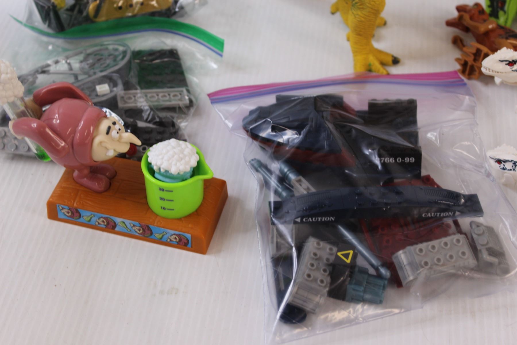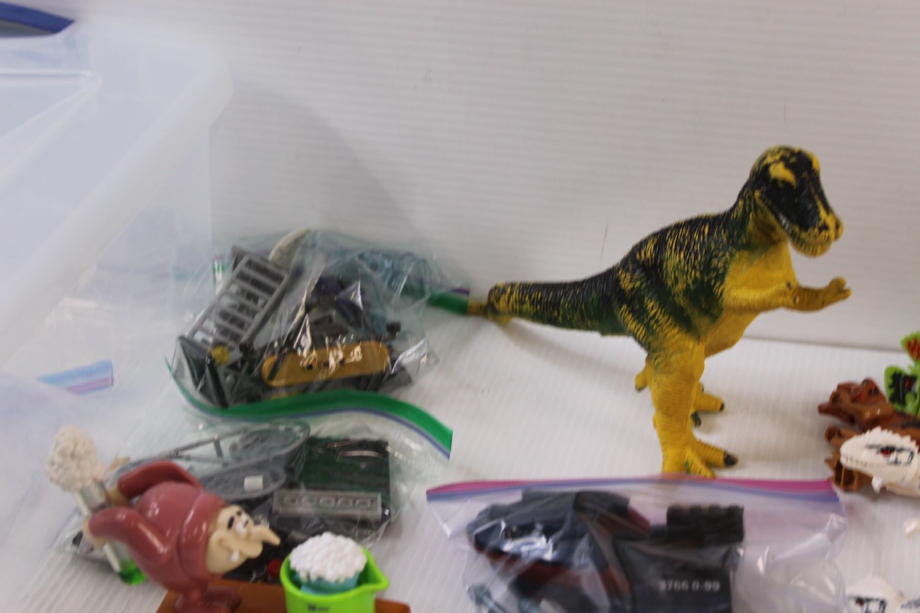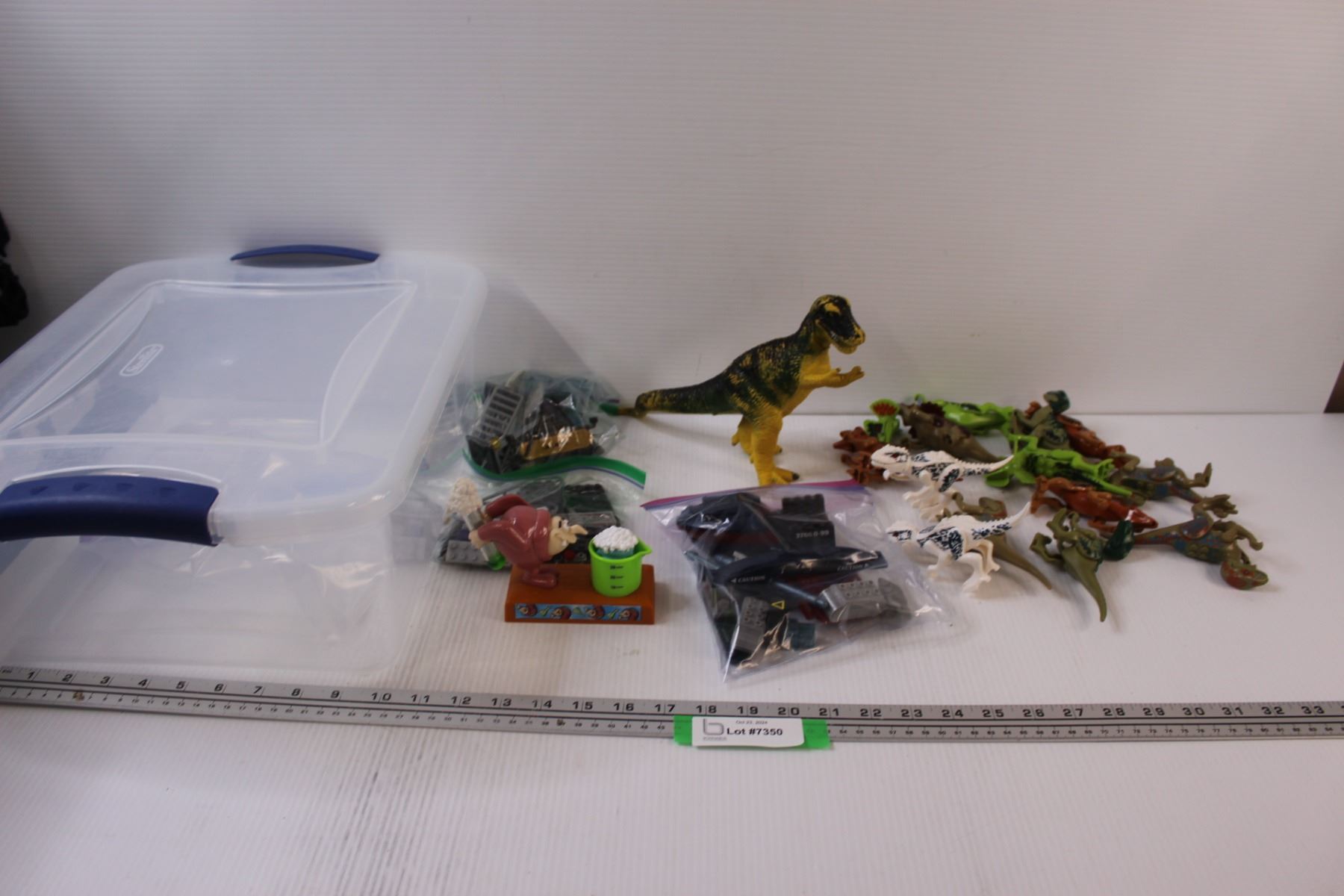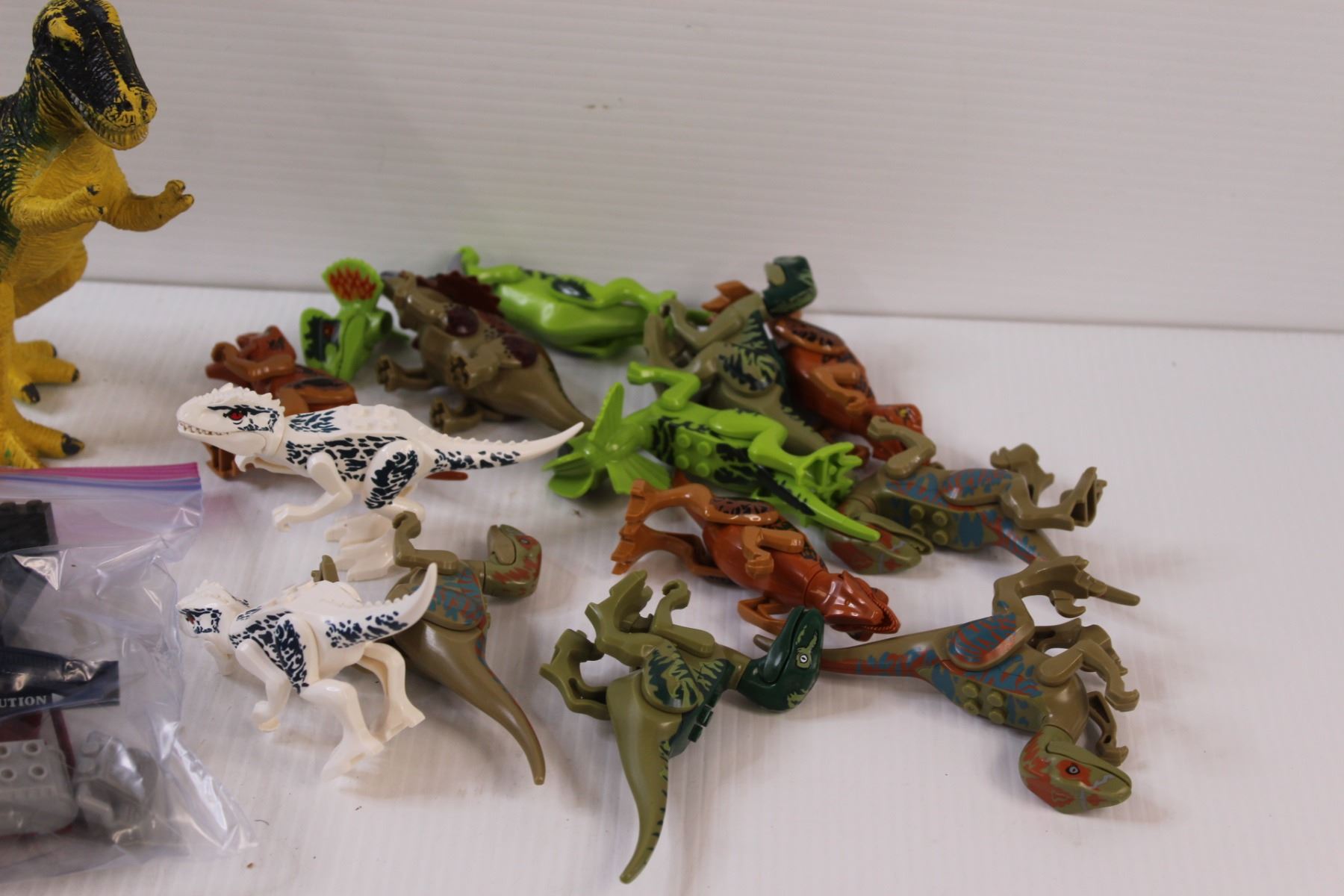 (12) Miniature Building Block Dinosaurs, (3) Building Sets, Dinosaur and Tote Box