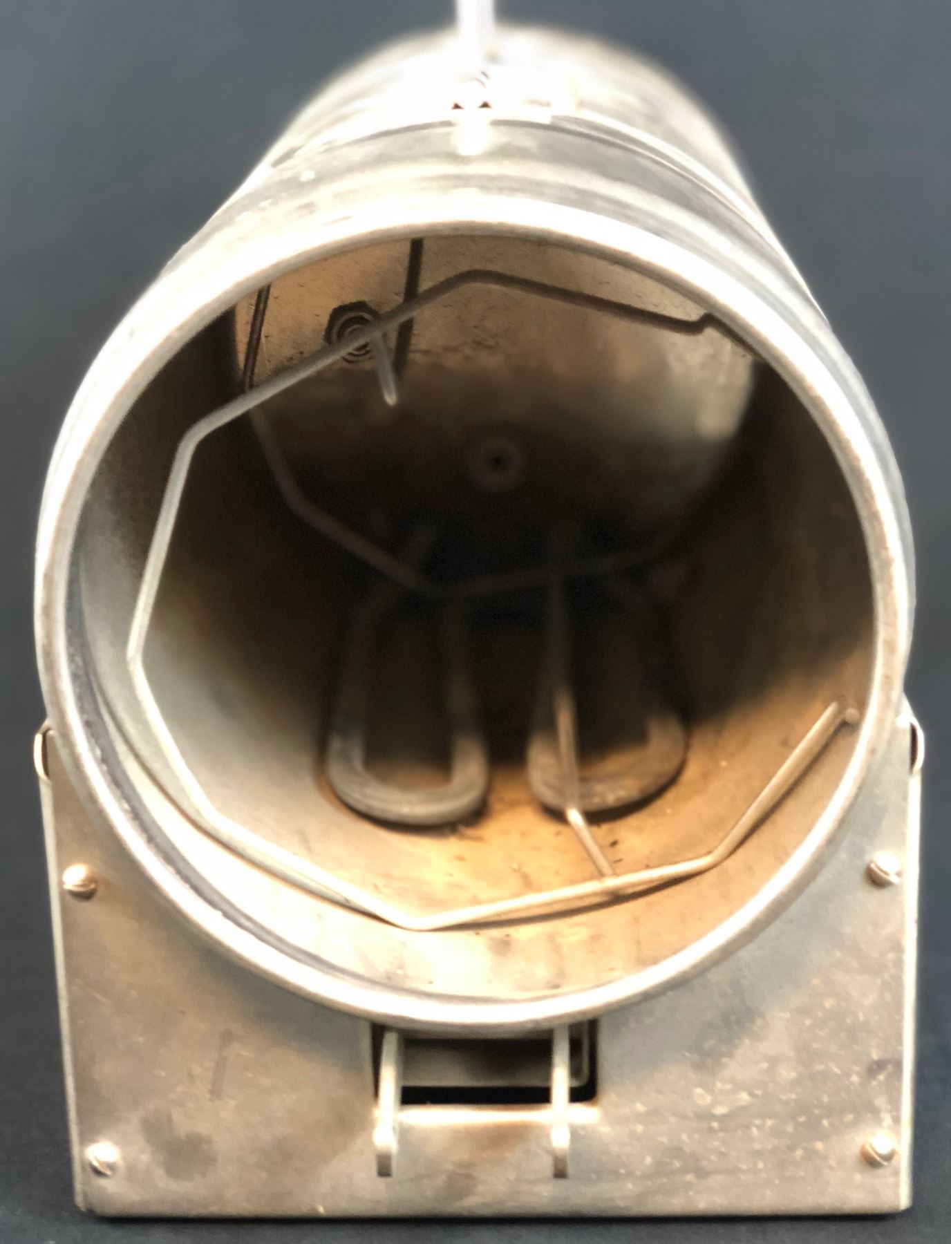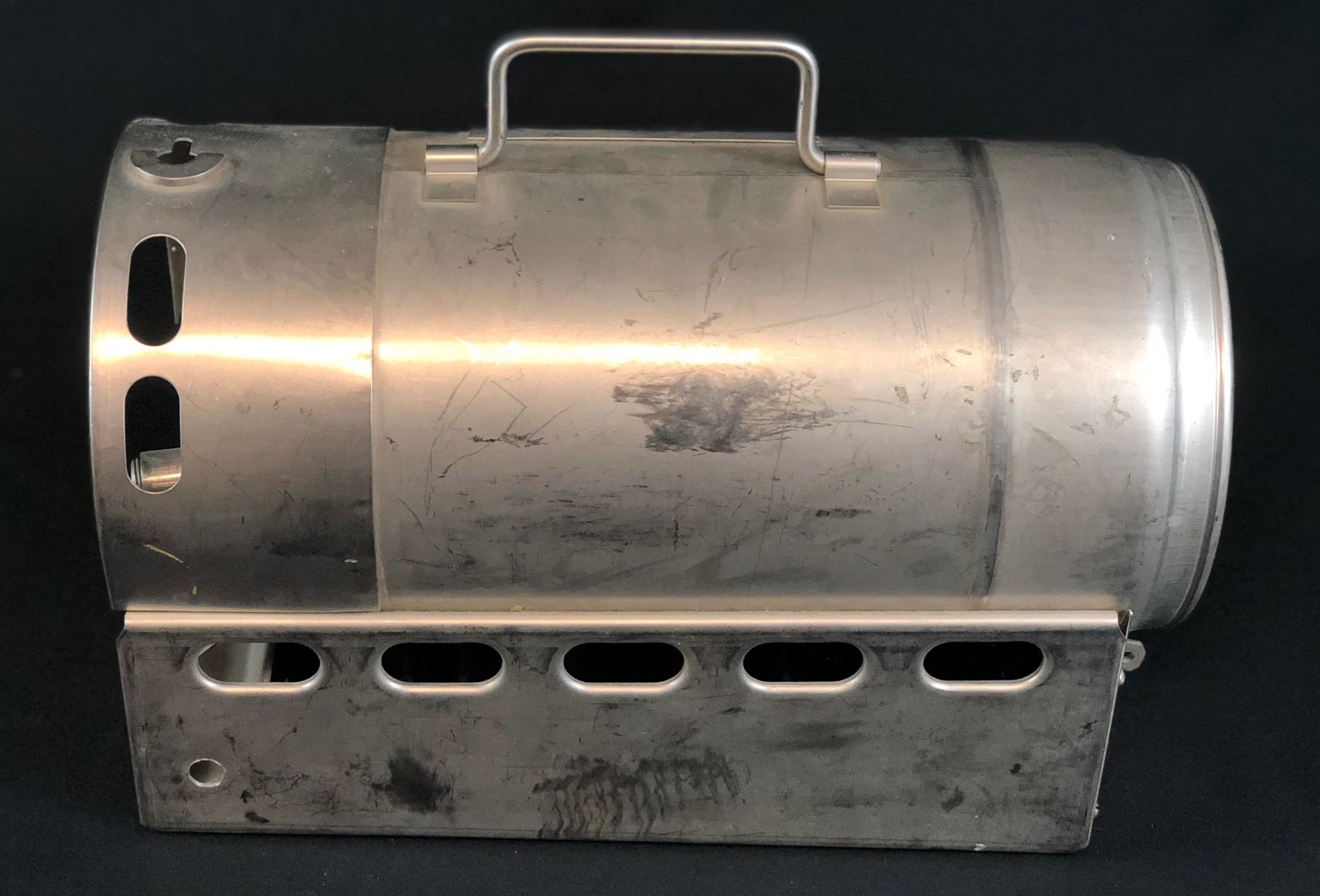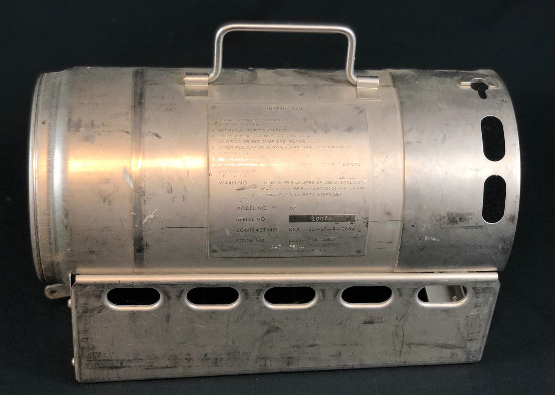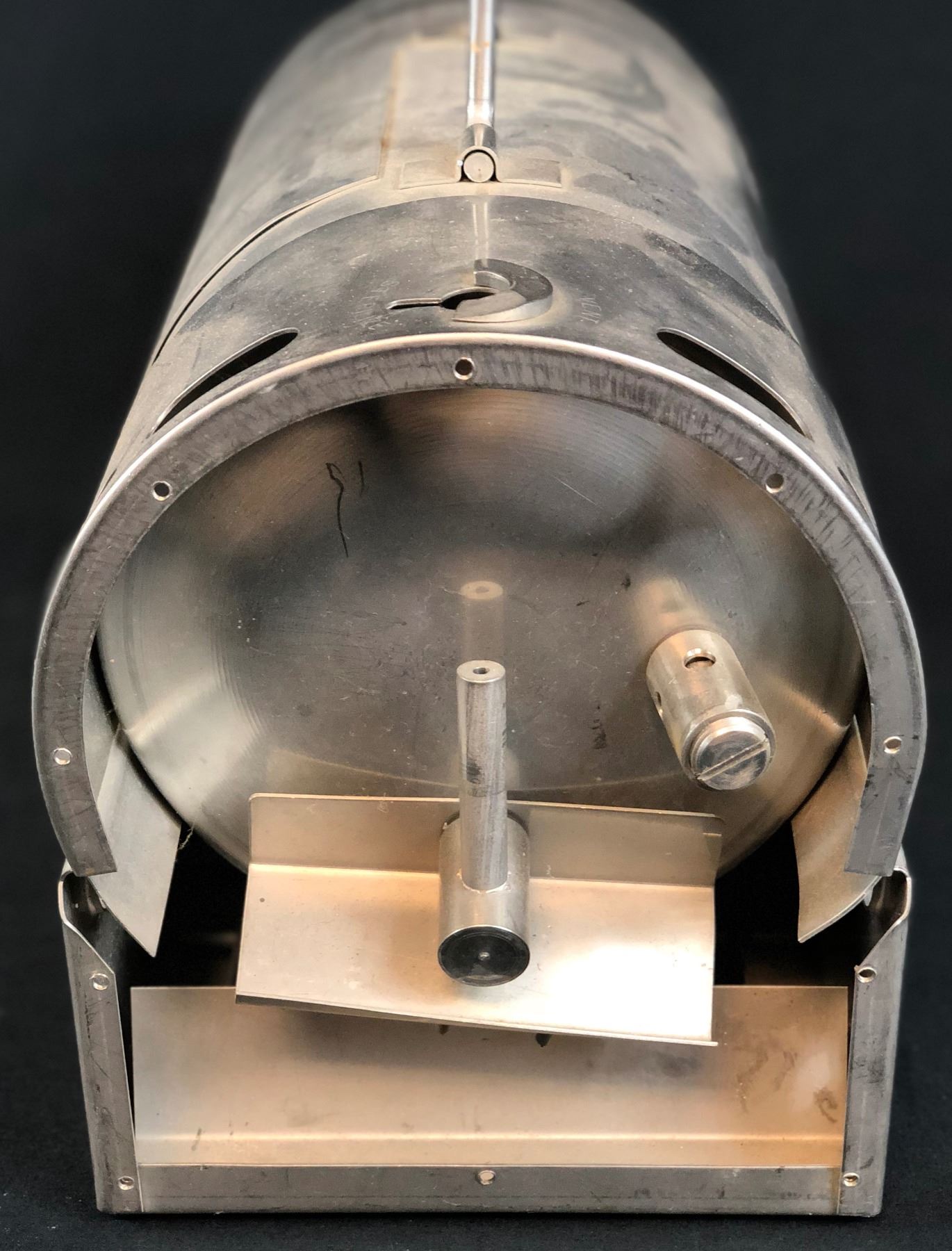 Original production made set piece of a metal cylinder with handle made for the neo-noir science fiction film "12 Monkeys" (1995), directed by Terry Gilliam, inspired by Chris Marker's 1962 short film La Jetée, and starring Bruce Willis, Madeleine Stowe, and Brad Pitt, with Christopher Plummer and David Morse in supporting roles where in a future world devastated by disease, a convict is sent back in time to gather information about the man-made virus that wiped out most of the human population on the planet.