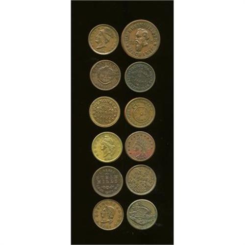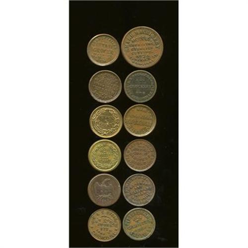 <B>12 Mostly Civil War Storecards, </B></I> but a patriotic Civil War token is included. The lot consists of: <B>Fuld-IL150BC-3a, R.5, AU55; Fuld-MA115EA-1a, R.5, AU55 Digs; Fuld-MI525D-2a, R.3, XF40; Fuld-OH165DD-1a, R.3, AU55; Fuld-OH535C-2a, R.2, XF40; Fuld-OH975I-1a, R.3, AU55; Fuld-PA765S-3a, R.3, XF40; Fuld-PA967A-1b, R.3, VF20; Fuld-WI510V-1a, R.4, XF45; Fuld-WI770A-1a, R.3, XF40; Fuld-WI960C-1a, R.5, XF40; </B></I>and a<B> Fuld-5/288a, R.2, AU50.</B></I><BR><BR><b>Shipping:</b> Coins & Currency (<a target="_blank" href="http://www.heritageauctions.com/common/shipping.php">view shipping information</a>)