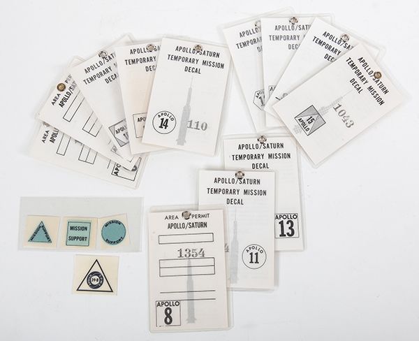 12 Nasa Area Permit Badges – Apollo 6 Through Apollo 17 (+4 Stick-On Decals). A complete set of manned Apollo mission permit badges. Each is incased in plastic with the missions clearly noted. A ringlet at the top allows for the wearer to attach it to a neck strap. The reverse reads "Property of the U.S. Government, issued for official use…" Also included are 4 stick-on decals which are seldom available. One for Apollo / Soyuz is triangular with 39-B in the center. Three others read "MISSION SUPPORT" – 1 each triangular, square and circular. How often can you acquire a complete set of Apollo badges all in very nice condition?