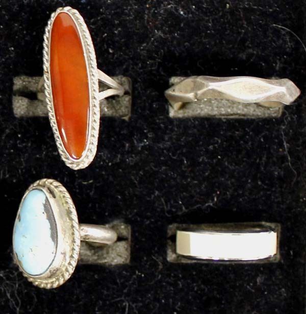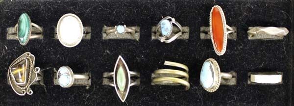 12 Native American Navajo Sterling Silver Rings, Mother of Pearl Size 6.5, Turquoise Size 6.25, Silver Size 10, Turquoise Size 8, Turquoise Size 7, Cat's Eye Size 8.5, Silver Band Size 13, Carnelian Size 6, Turquoise Size 5, Turquoise Size 7, Mother of Pearl Size 6.5, and Malachite Size 7, longest ring measures 1.25''L