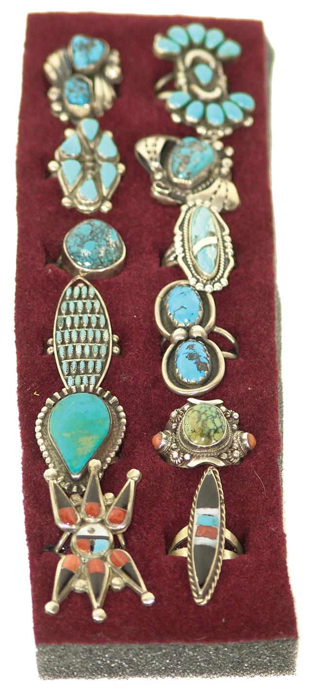 Circa 1970s-80s, Collection of 12 choice vintage hand wrought silver, turquoise, coral, and jet rings. Various sizes