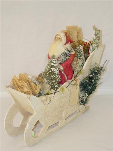 12" PAPIER MACHE SLEIGH W/ SANTA & CHRISTMAS TREES & PRESENTS (PROBABLY JAPANESE) - LOSSES & WEAR TO PAINT, DAMAGE TO 1 RUNNER OF SLEIGH
