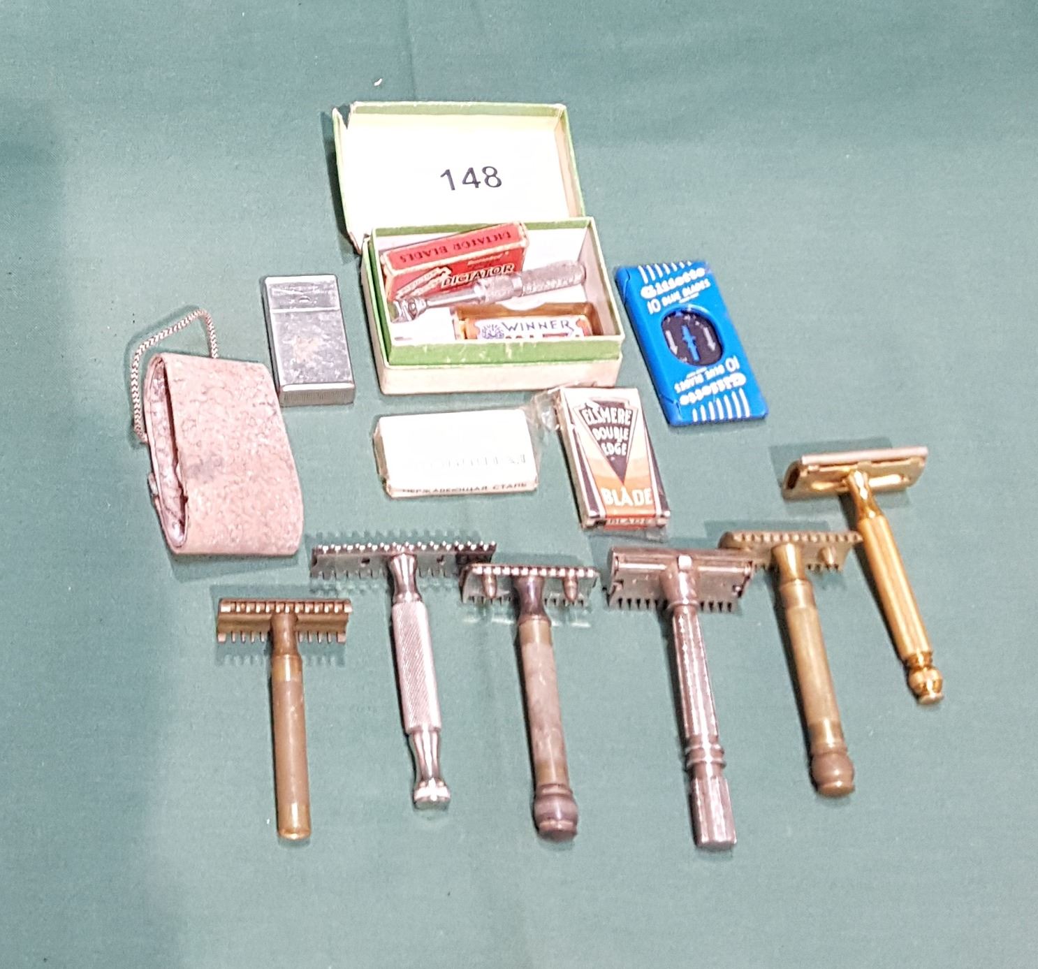 12 PCS VINTAGE SHAVING RAZORS, BLADES, STROP ETC
