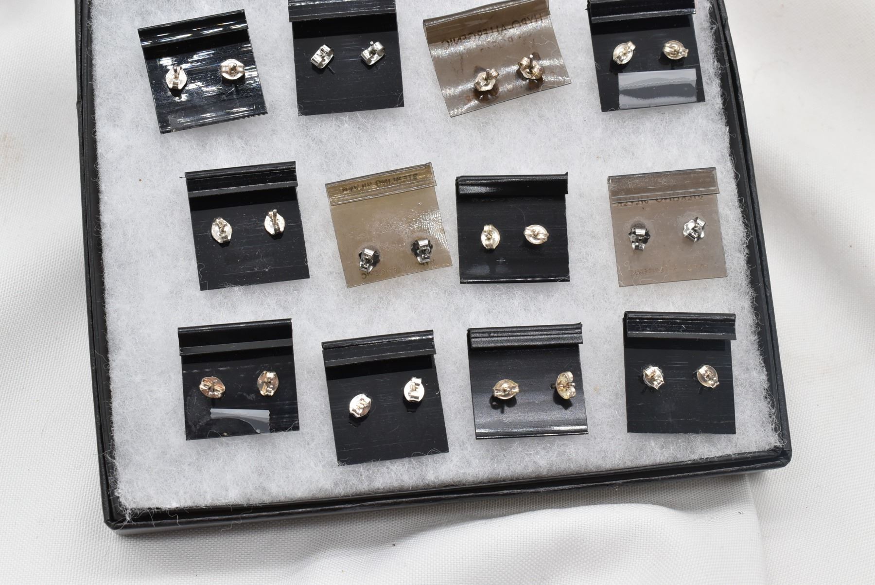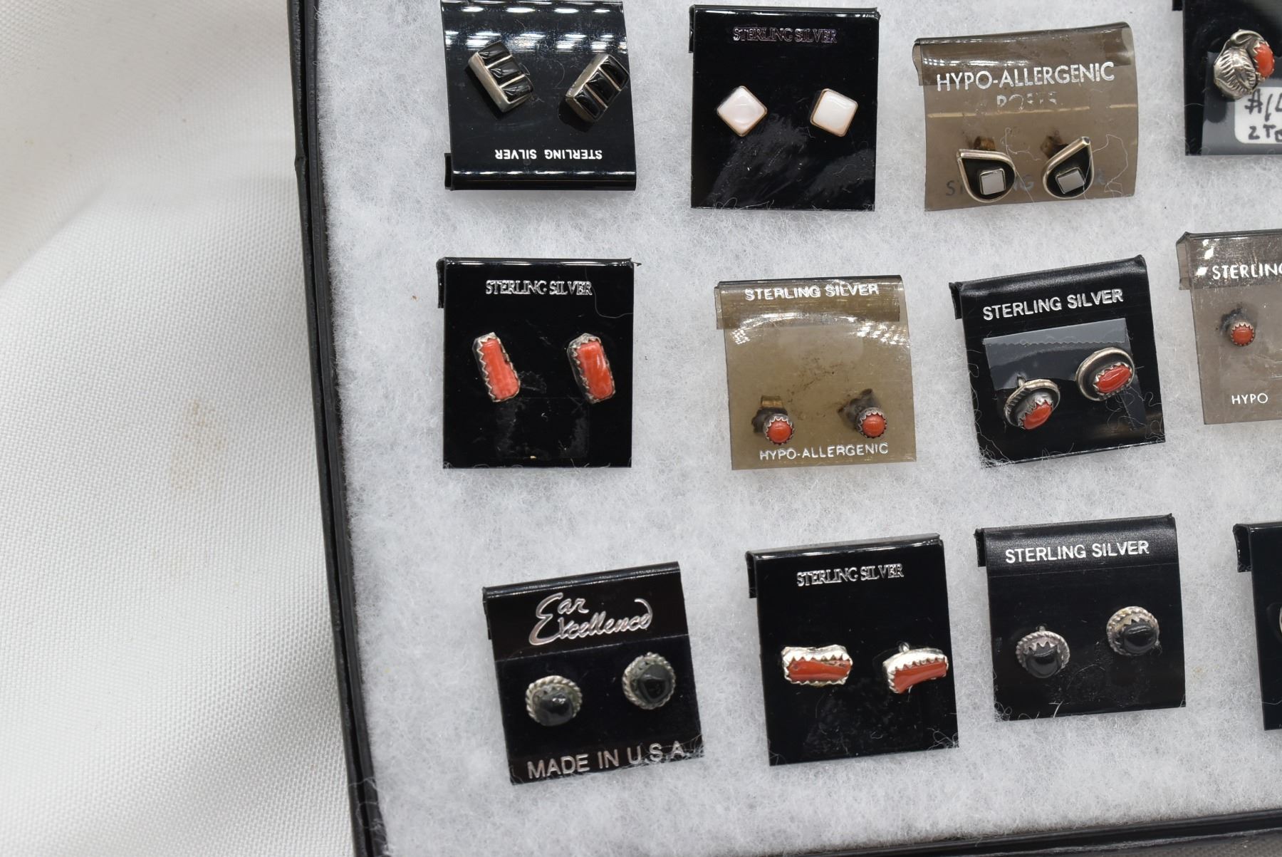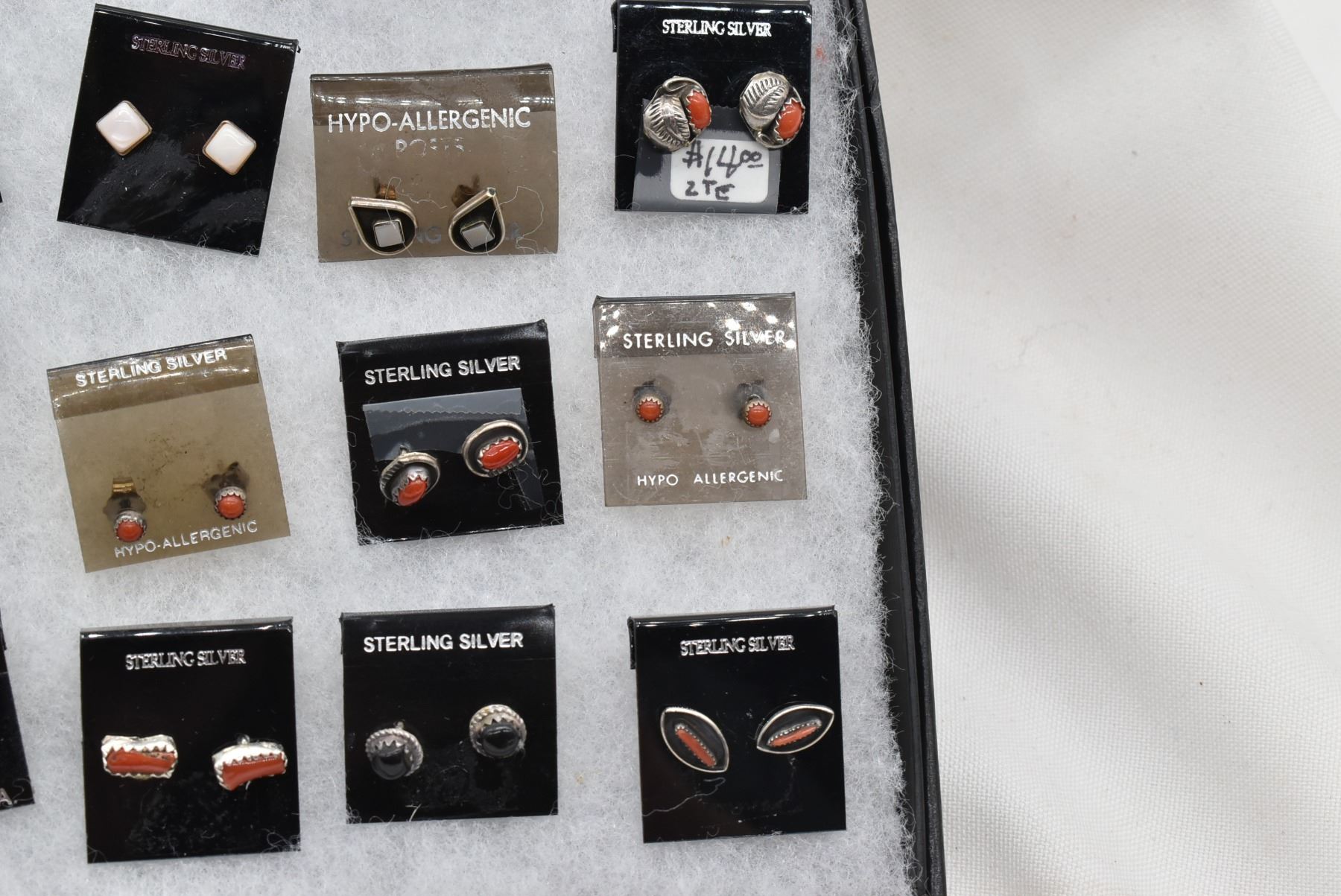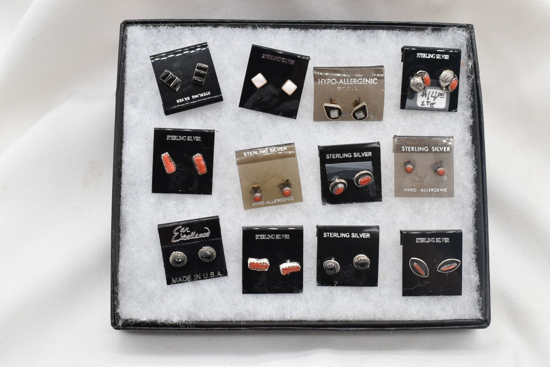 12 Pairs of Native American Post Earrings, includes sterling silver, turquoise, coral, pink mother of pearl, onyx, and mother of pearl, sizes vary, longest measures approximately .25''