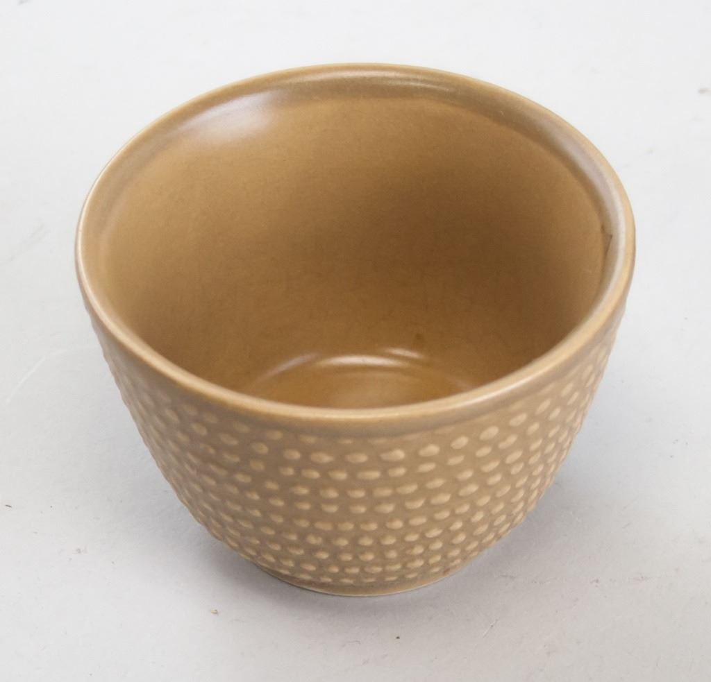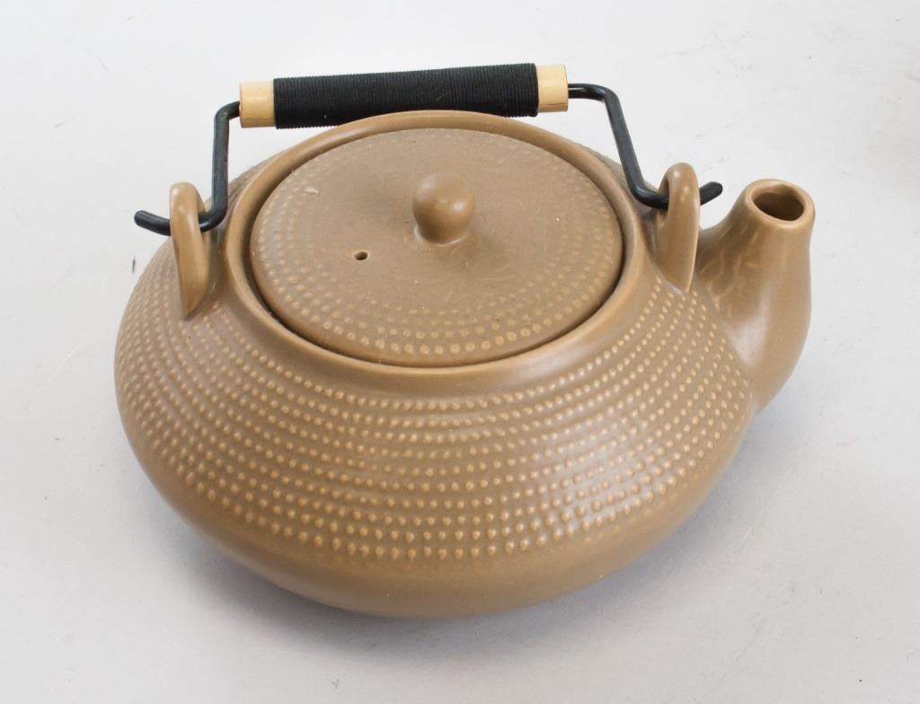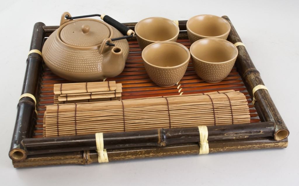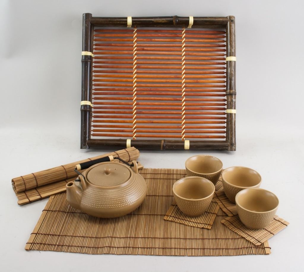 Japanese tea set. With one teapot, four cups, four bamboo saucers, two large bamboo mats, and one tray. 35 x 39 cm. Height: 10 cm. 1,551 grams (total).