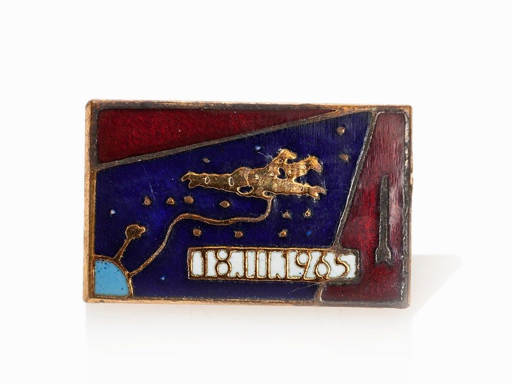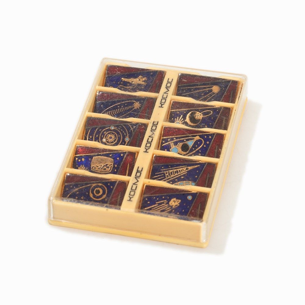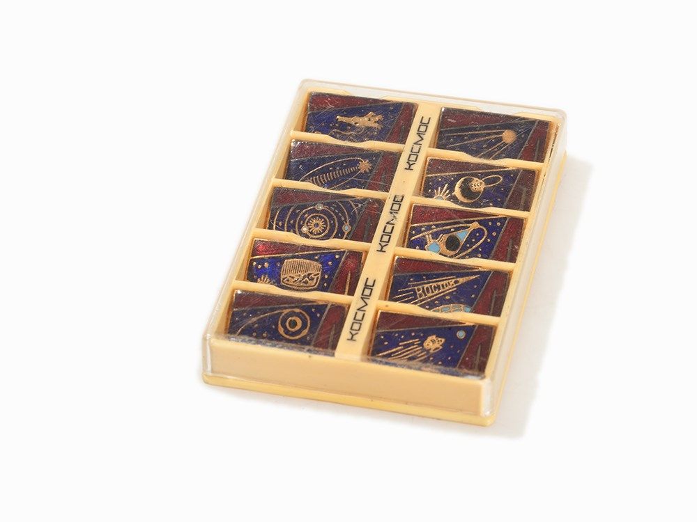 These are twelve pins commemorate important missions of the Soviet aerospace. Each pin represents a space mission and bears a space motif and the respective date in polychrome enamel. The pins bear the dates 18.III.196, 4.X.1957, 23.IV.1965, 12.IX.1959, 16.XI.1965, 4.X.1959, 31.I.1966, 12.IV.1961, 31.III.1966 and 1.XI.1962. The pins are stored in the original case with the inscriptions of every pin in Cyrillic on the reverse of the case.