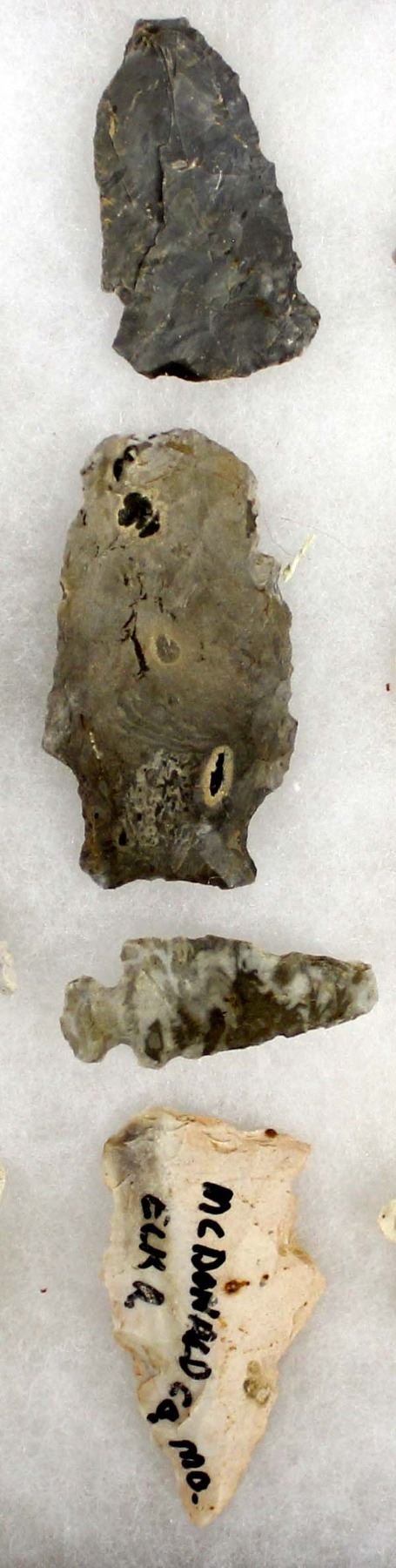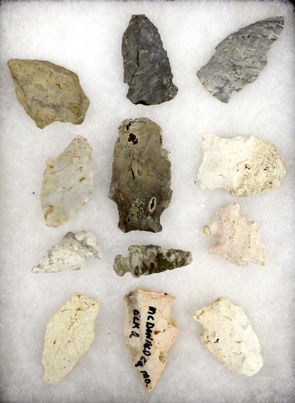 Collection of 12 Prehistoric Native American Arrowheads, longest measures 3''L, 4 are labeled McDonald County, MO