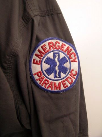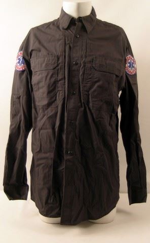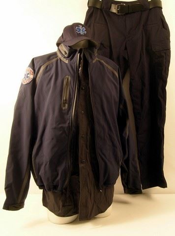 Jay (Colin Lawrence) screen worn, hero, navy blue with multiple zipper pockets, zipper up the front with Emergency Paramedic patches on the sleeves 'Stormtech' jacket, dark grey long sleeve with pockets on the front and Emergency Paramedic patches on the sleeves '5.11 Tactical Series' shirt, (size L) light grey short sleeve 'American Apparel' t-shirt, (size L) navy blue Paramedic 'Flexfit' cap, black leather belt, and dark navy blue with cargo pockets '5.11 Tactical Series' pants. (size 36x34)