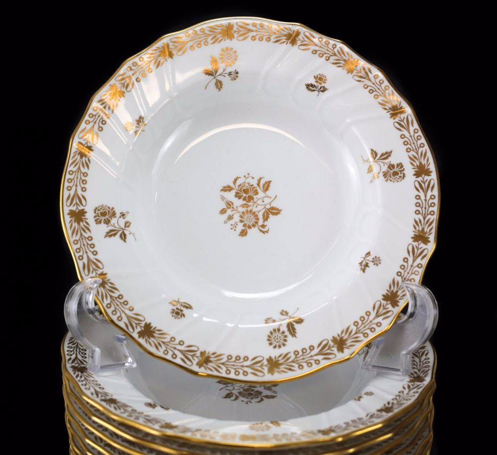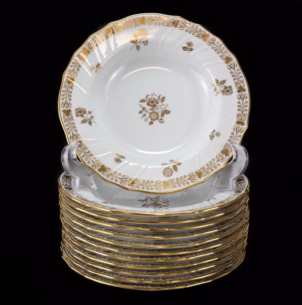 12 Spode Copeland England porcelain dinner plates retailed by Tiffany & Co., circa 1900. Gilt scalloped rim with gilt floral center.