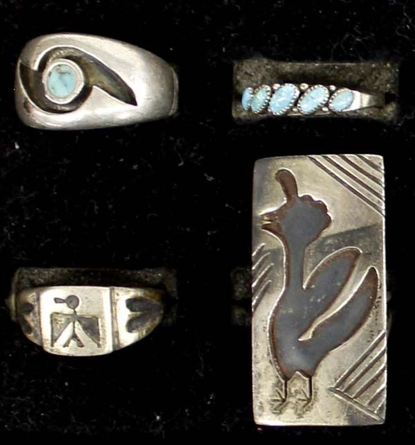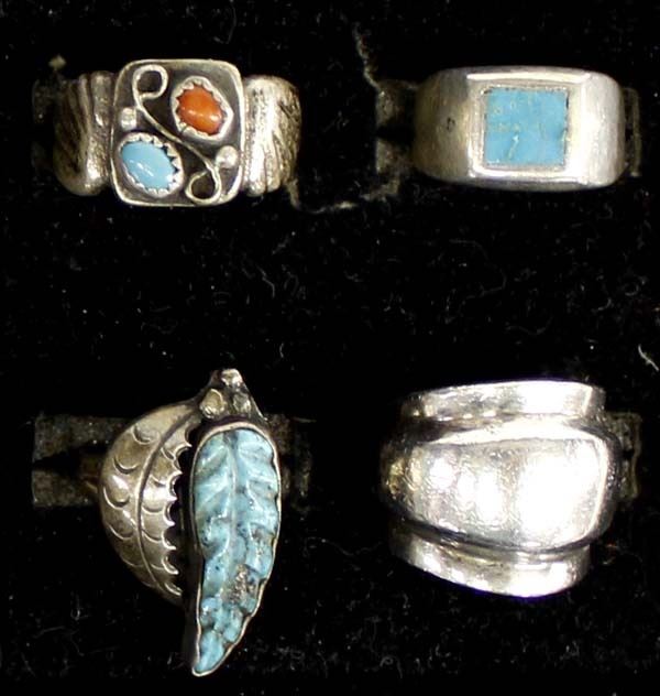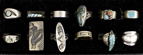 12 Sterling Silver Rings, Mostly Native American, assorted sizes ranging from size 5 to 10, longest ring measures 1.5''L, 2 of the rings are marked Taxco, includes turquoise and coral, Navajo--Zuni--Hopi, 83.01gtw