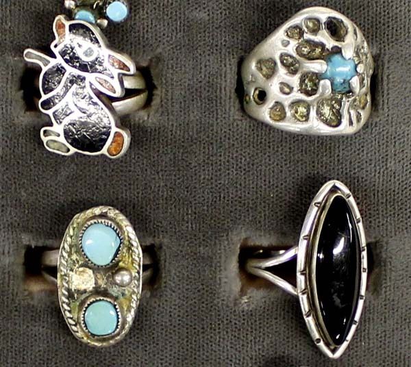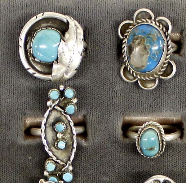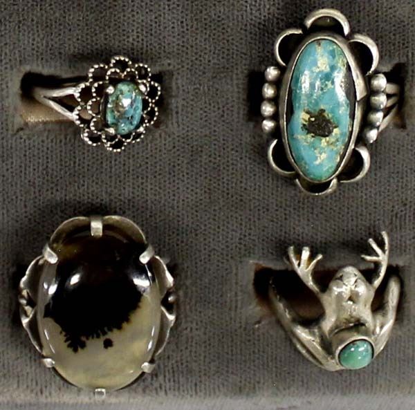 12 Sterling Silver Rings, Some Native American, stones included are turquoise, coral, jet, onyx, and dendritic moss agate, longest ring measures 1.25''L