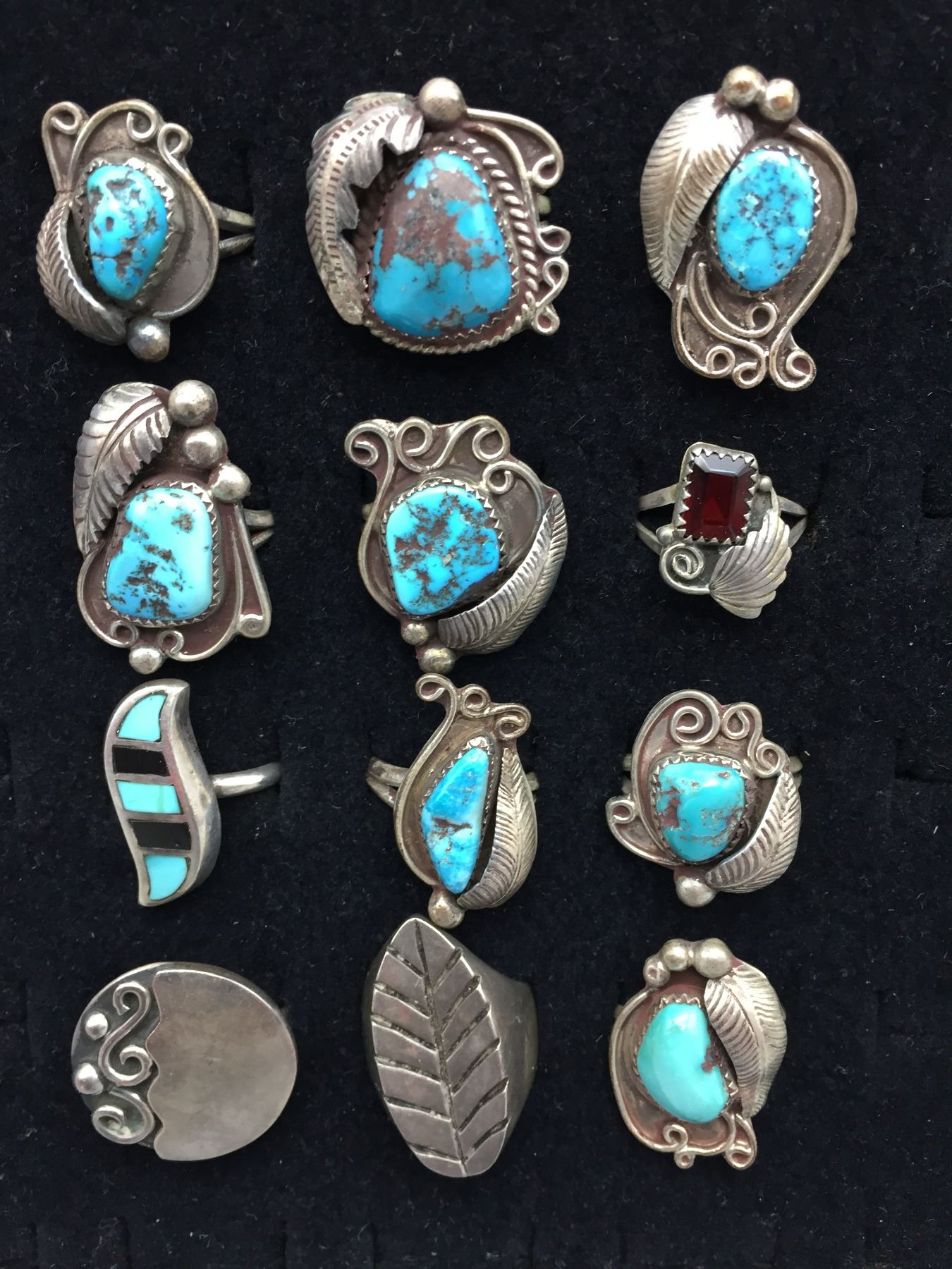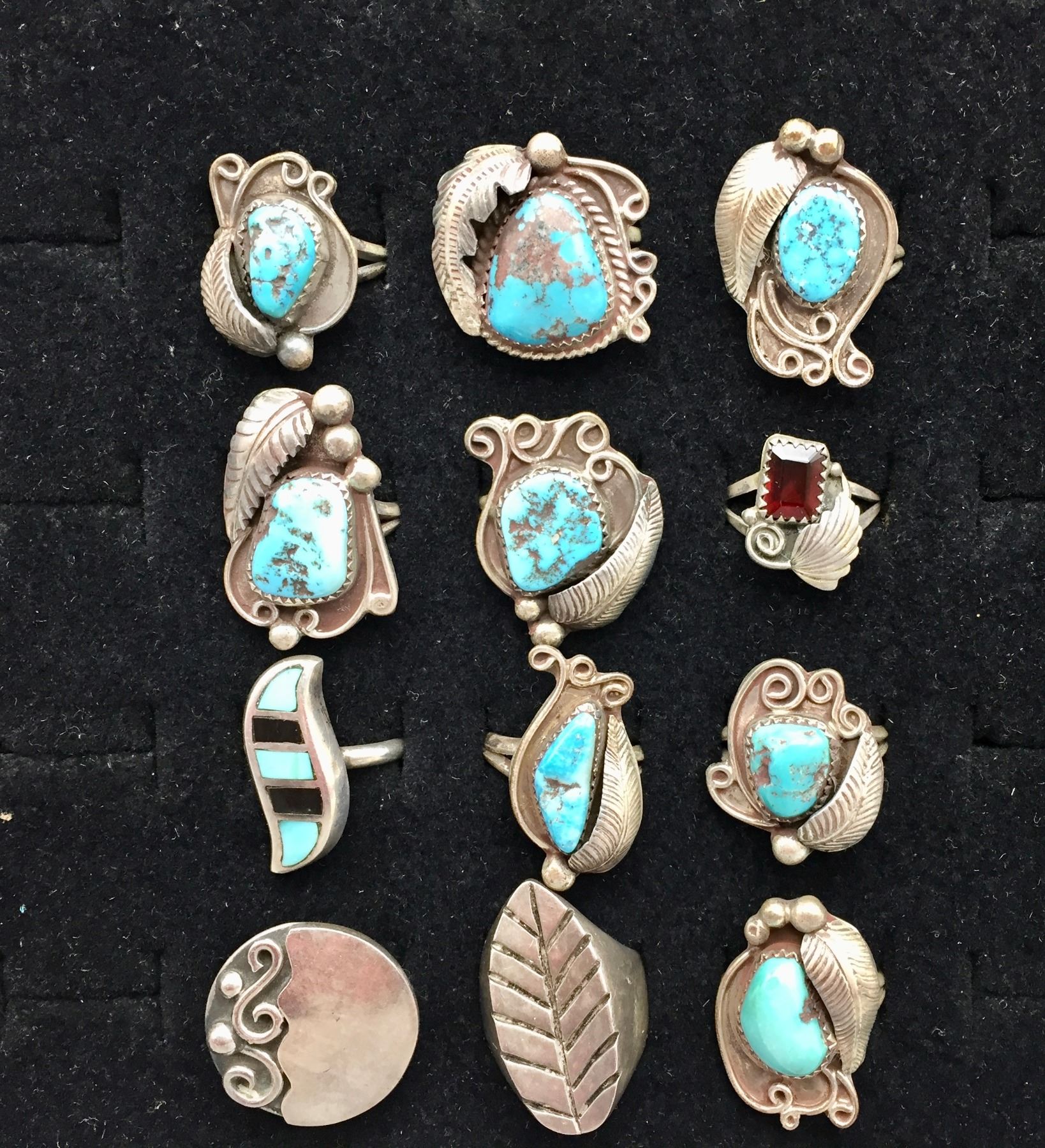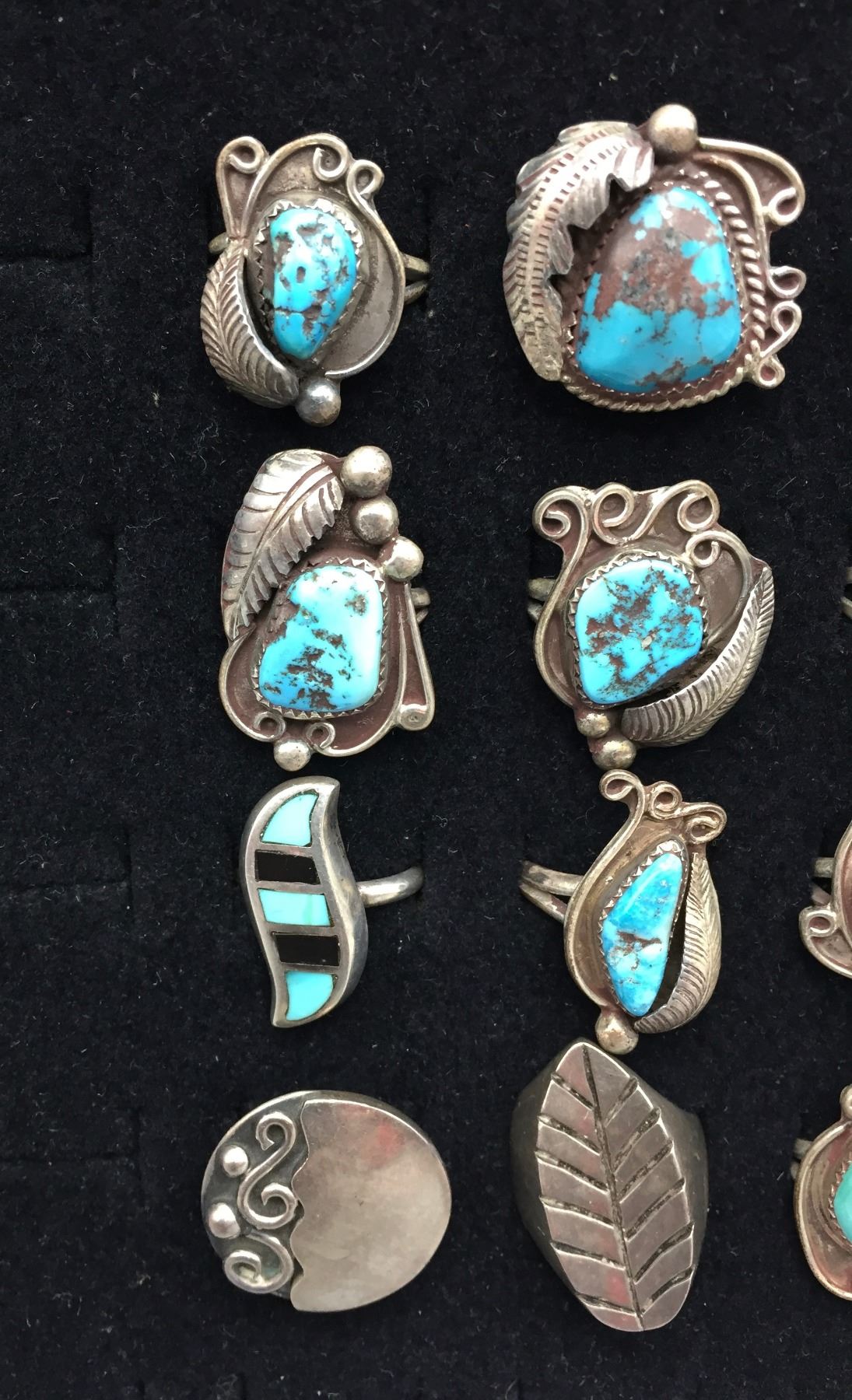 Description: Featured in this lot is multiple styles of vintage turquoise and sterling silver rings. All are sterling silver where applicable.                                                                                                           Maker: Various.                                                                                                                 Approx. Age: Vintage.                                                                                                            Size: Various. Weighs 87.3 grams.                                                                                                                                                                                                                                 Condition: Good for their age, normal wear expected.                                                                                                                Please look closely at the pictures - they are an important part of our description.                                Shipping: There will be a $5 handling / packaging fee for shipping this lot. The actual cost of postage will be added on top of that.