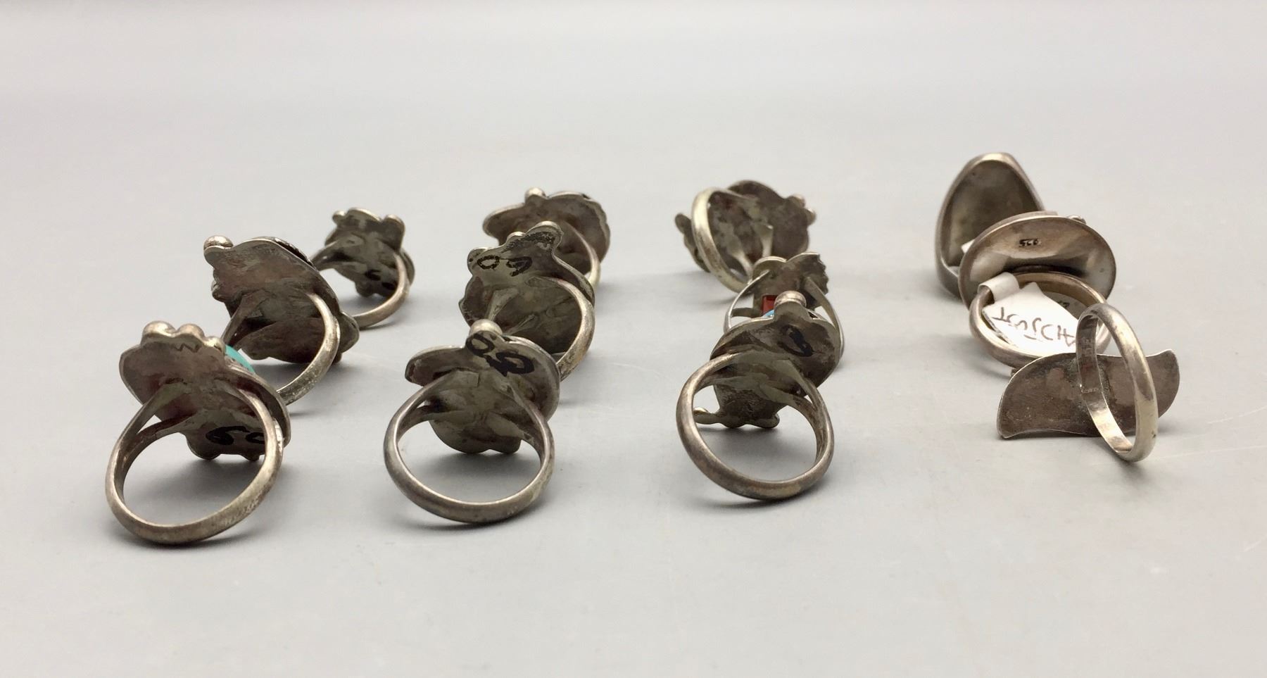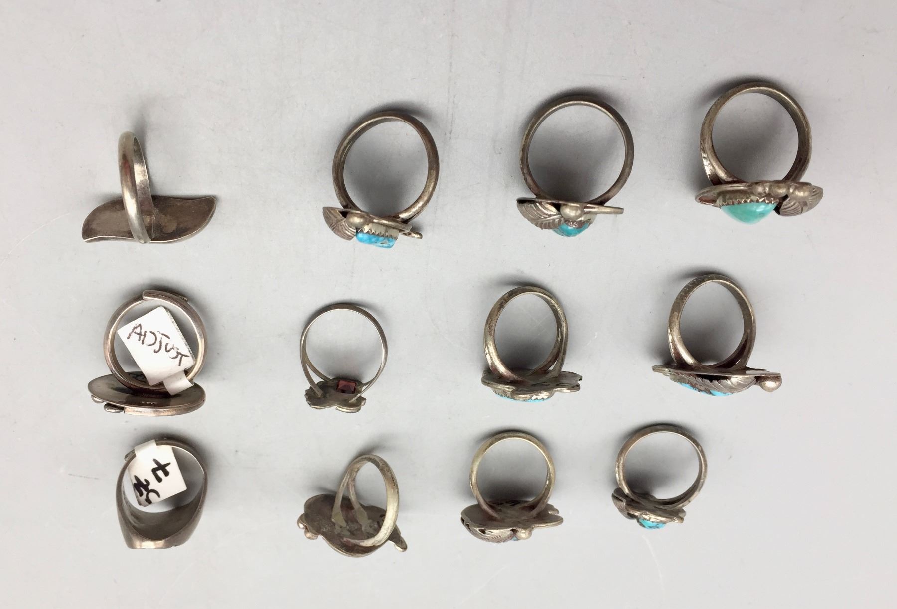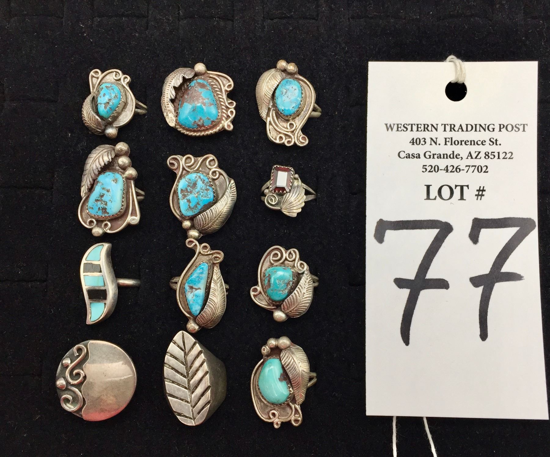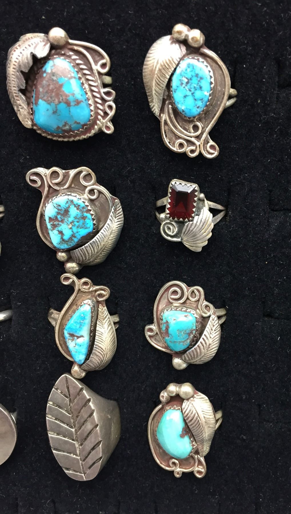Description: Featured in this lot is multiple styles of vintage turquoise and sterling silver rings. All are sterling silver where applicable.                                                                                                           Maker: Various.                                                                                                                 Approx. Age: Vintage.                                                                                                            Size: Various. Weighs 87.3 grams.                                                                                                                                                                                                                                 Condition: Good for their age, normal wear expected.                                                                                                                Please look closely at the pictures - they are an important part of our description.                                Shipping: There will be a $5 handling / packaging fee for shipping this lot. The actual cost of postage will be added on top of that.
