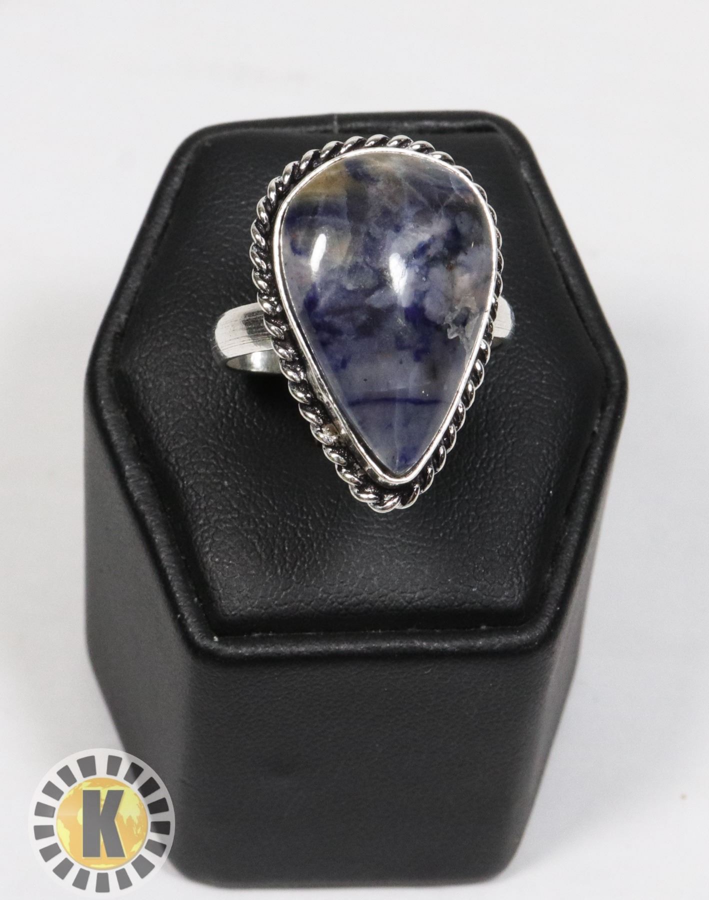OF BLUE, FROM DEEP COBALT TO PASTEL, STONE HAS A SPIRAL ROPE DESIGN, SETTING IS STAMPED 925 SILVER, SIZE 9.5. JEWELRY***ITEM(S) LOCATED IN LETHBRIDGE ALBERTA