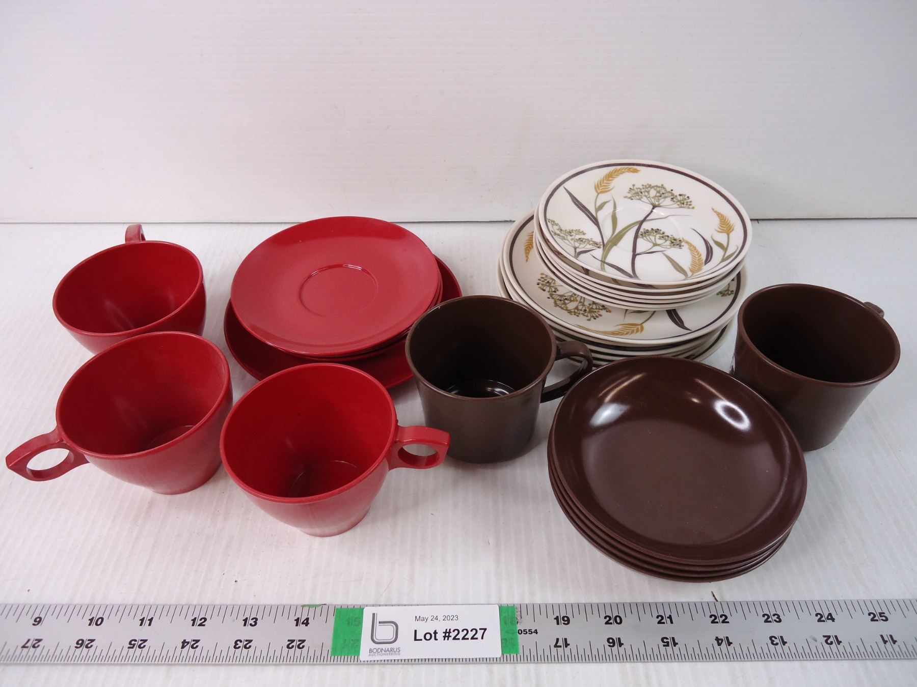 (12) Texas Ware Melamine Salad Plates and Saucers, Assorted Brown and Red Melamine Mugs, Saucers and Bowls