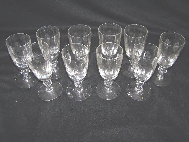 Set of 12 Tiffin Cameo Etching cordials. Fine hand cut crystal. Condition is good. Approx 5.5" tall.