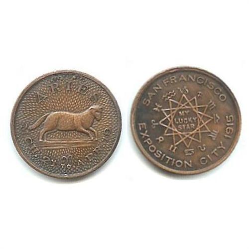 12 souvenir astrological copper tokens dated 1915 for the San Francisco Pan Pacific Exposition, each with individual signs of the zodiac on one side. Each measures 1" in diameter.