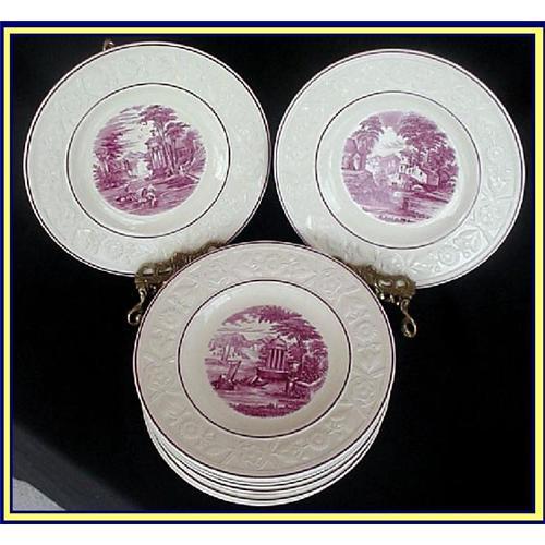 Set of 12 Wedgwood plates in puce / pink and cream with raised molded borders and Classic scenes. Made in England circa 1924.<BR>9 1/2inches diameter.<BR>Cream ground with molded flowers and foliage in a ring around the border.<BR>The bowl has one of 4 puce transfer Classic scenes, depicting ruins, rivers, boaters, landscapes, Italianate in style.<BR>Each plate is marked on the back with a red Wedgwood Etruria England mark as well as red script written numbers. Impressed Wedgwood Made in England, M, <BR><BR>4F? (indicating 1924 - See Godden's handbook of British pottery & porcelain marks).<BR>Excellent condition. I found no chips/cracks/damage of any sort.