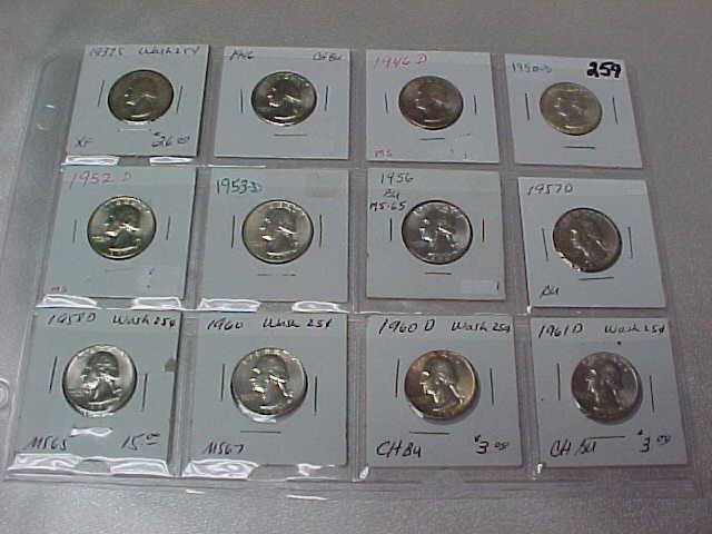 12 Washington Quarters in 2x2, XF-BU, no repeat: 37S, 46PD, 50D, 52D, 53D, 56, 57D, 58D, 60PD, 61D