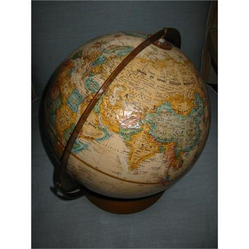 12" world classic series Globe with Coppertone metal stand, and very attractive. it is decorative - collectible and very useful. it has two or more crest and description reads: REPLOGLE 12 INCH DIAMETER GLOBE WORLD CLASSIC SERIES.